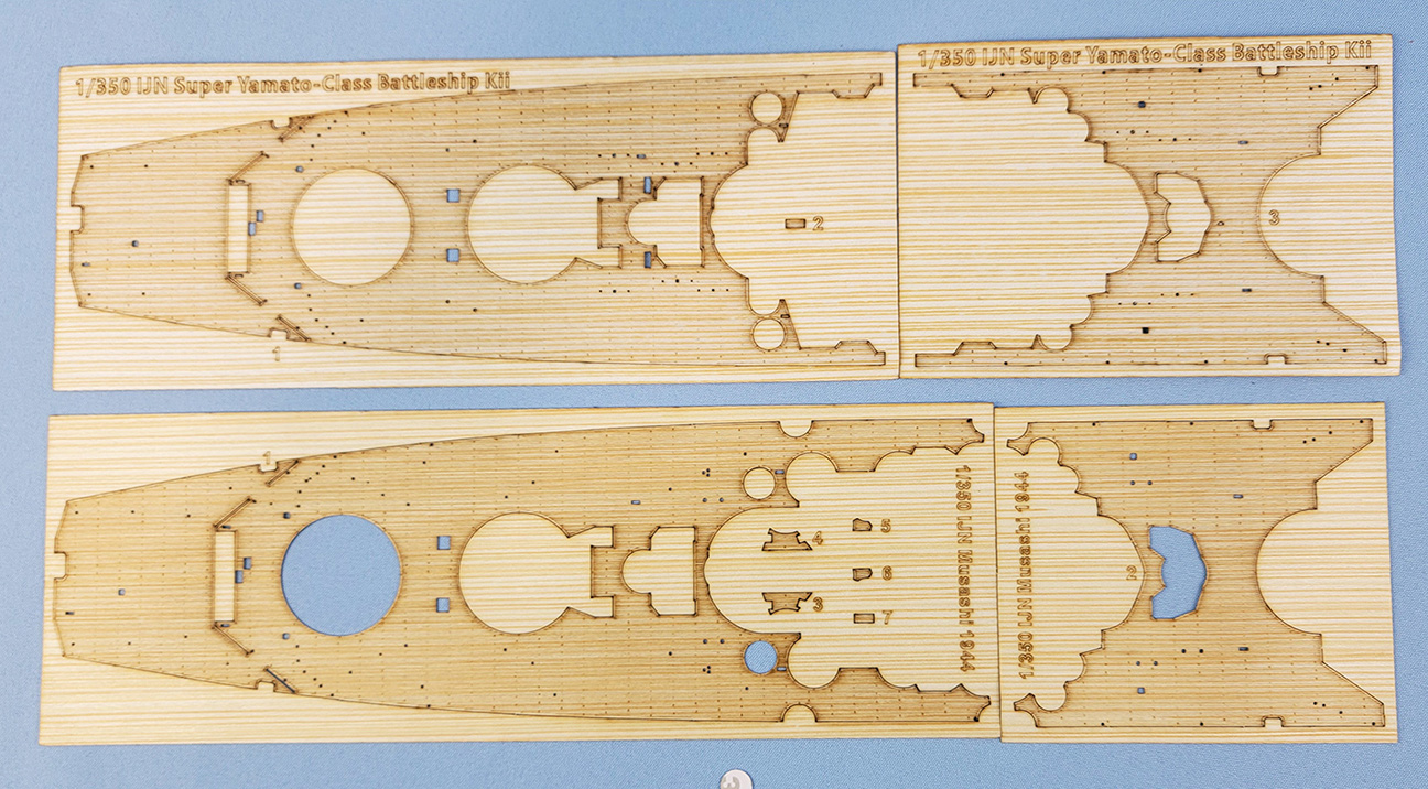 | A planked deck is included as an option. It’s very nicely done and is a good option for those who don’t like to paint and wash their decks. A comparison photo (Kii top, Musashi bottom) shows a subtle difference in the deck layout surrounding the 01-deck holding the tertiary (10cm) batteries. | ||||||||||||||||||||||||||||
