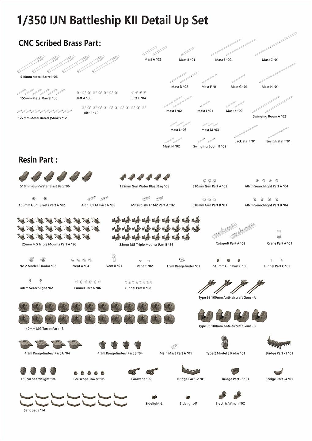 Just released in August 2025, VeryFire’s new 1/350 Super Yamato kit has a limited-edition run of 1000 units, worldwide. It’s a deluxe version kit with full PE and 3D printed parts based on VeryFire’s own, recently released Yamato kit. Given this new kit’s basis in the Yamato kit, this review will focus on the new parts that differentiate it from the Yamato (and Musashi) kits. At a guess, approximately 85 to 90% of the styrene portion of the kit is carried over from the Yamato kit. The main points of differentiation are the main (51cm), tertiary (10cm), and quaternary (40mm) armaments. The only substantial structural change is the 01 deck that surrounds the central superstructure and holds new tertiary battery mounts. Likewise, most of the turned brass is carried over from the Yamato kit, save for the main battery barrels. There is also a greater reliance on 3D printed parts for the smaller armaments, fire controls, signaling equipment and radars. In turn, there are a great many pieces on several Yamato sprues that go unused, which is great for the spares box. There are also some changes to the photoetch frets that come with the kit to accommodate the changes in fit. To reference the fundamental styrene injected parts from the original kits, please see Martin Quinn’s November 2024 review of the Veryfire Musashi kit here: http://www.modelwarships.com/reviews/ships/ijn/bb/Musashi-350-vf/VeryFire350Musashi.htm The review sample was missing Sprue E, which carries the aircraft handling deck as well as the unused decks that surround the central superstructure for the late war Yamato. Veryfire was very prompt about acknowledging its absence and in shipping out a replacement piece upon notification. They noted that Sprue E was omitted from the sprue display in the instructions, and their warehouse neglected to include it in our review kit. Also worth noting is that there is no Sprue IF, which carries the parts to a F1M1 “Pete” reconnaissance floatplane and catapult. An additional Sprue IG has been included instead. This substitutes one E13A “Jake” floatplane and catapult for the Pete. Parts on several sprues are meant to be ignored such as the styrene searchlights and the single and triple 25mm barrels for the enclosed AA mounts. These are replaced by new 3D printed parts and weapons. |