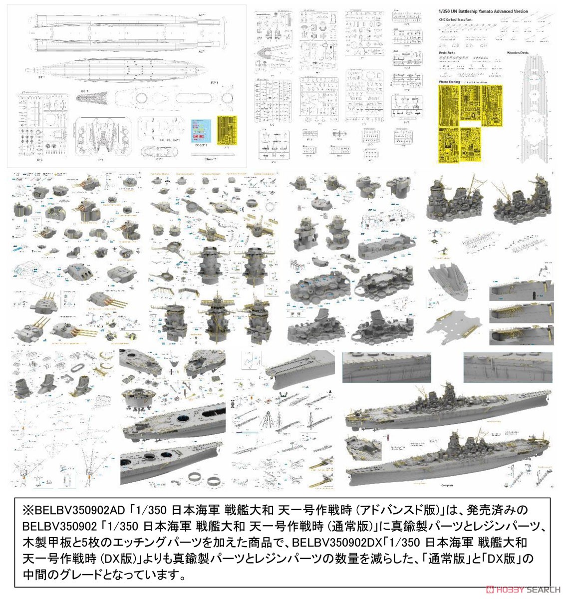 One accompanying photo displays the identicality of the Yamato/Musashi parts in the top row, with the Kii parts on the bottom. Two other photos focus on the difference between the 51cm and 46cm barrels of the Kii and Yamato/Musashi kits, respectively. |