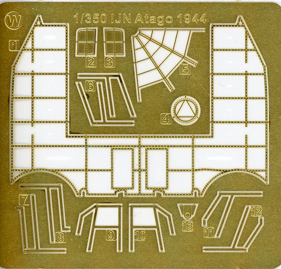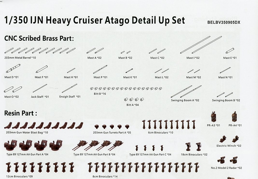 | Almost everything in the deluxe edition is the same as Takao, except that there are 15 3D print rafts (basic and deluxe) in Atago, compared to 12 in Takao. The number of photo-etch frets and turned brass appears to be identical. | ||||||||||