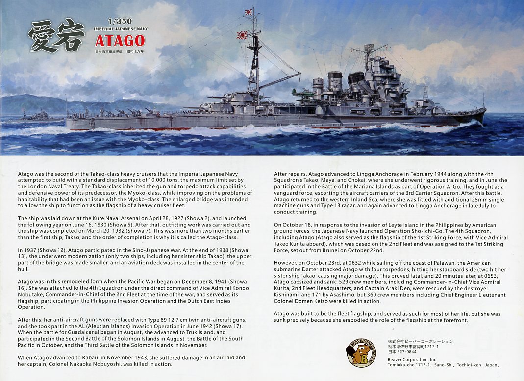 The Takao-class ships were approved under the 1927 to 1931 supplementary fiscal year budget, and Atago, like her sister ships, was named after a mountain. In this case, she was named after Mount Atago, located outside Kyoto. Even though Takao was the name ship of the class, Atago was actually finished before Takao. Along with her sister Takao, Atago was fairly active during the Pacific War, including taking part in the Second Naval Battle of Guadalcanal, where she scored hits on the American battleship South Dakota. On October 23, 1944, while transiting the Palawan Passage as part of the Japanese "Center Force", which was attempting to contest the American landings on the island of Leyte, in the Philippines, Atago was struck by four torpedoes fired from the American submarine USS Darter. She was gutted like a fish, capsizing and sinking in just 18 minutes. For more on the Atago, check out her Wiki page here, where partz 20.\[=-0of this truncated history came from. |
