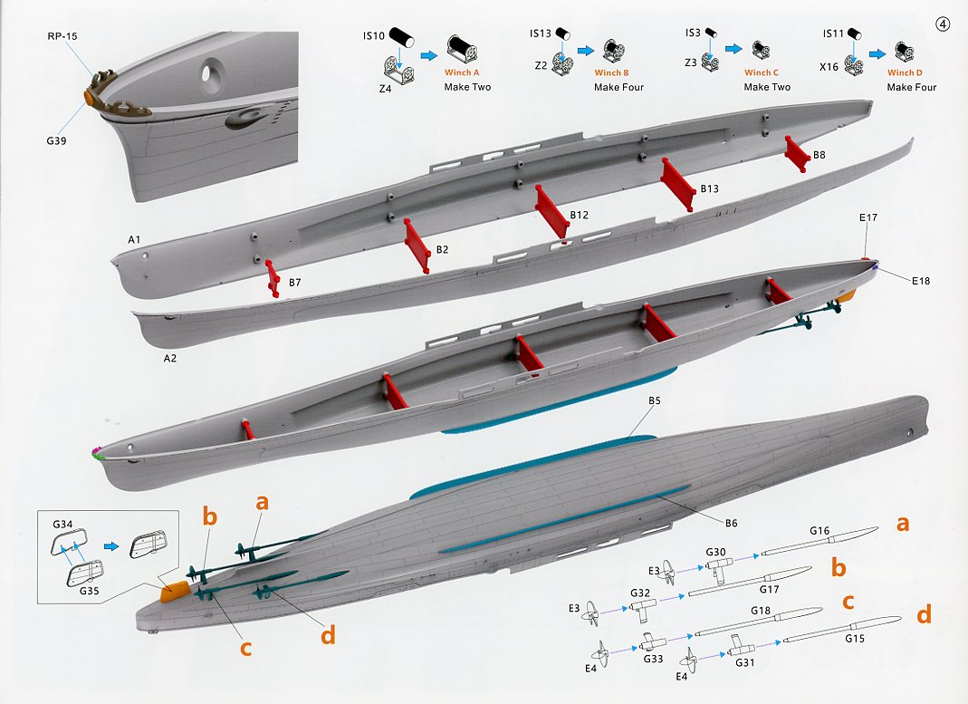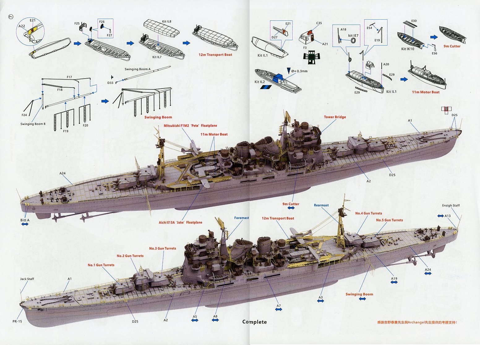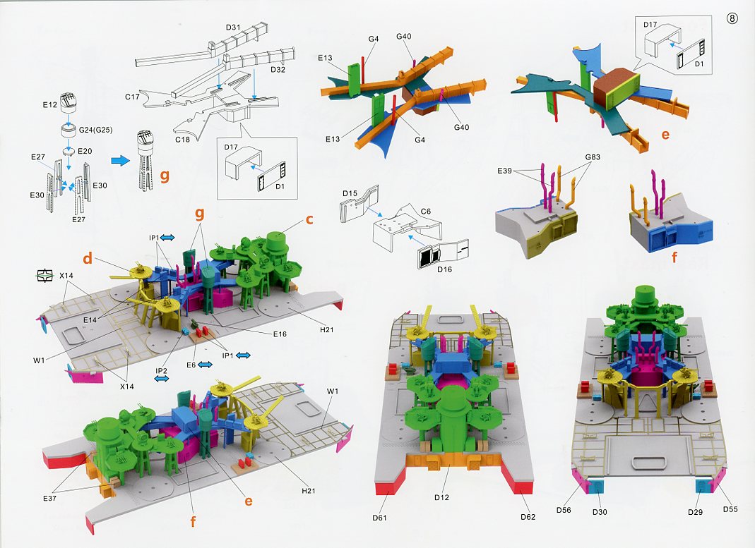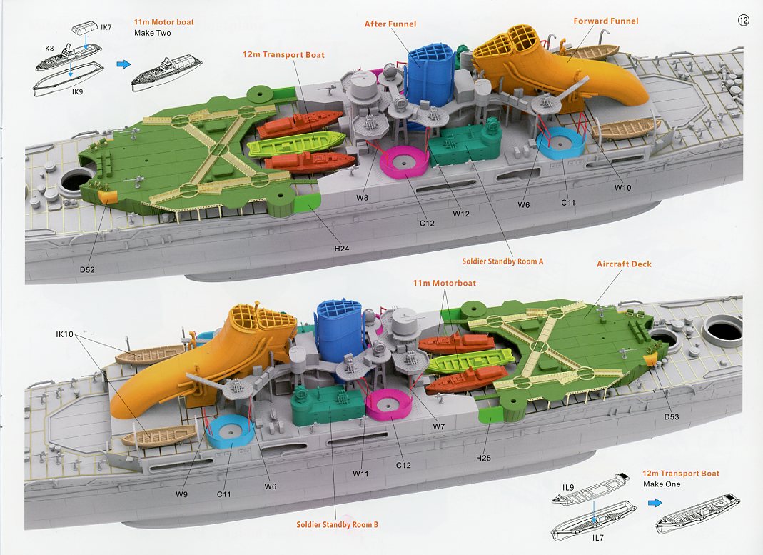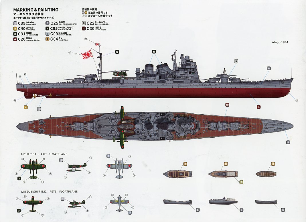 | Similar to the Takao, there’s a reprint of the cover art with a short history of Atago in English. The instructions are 19 pages long, with parts manifest, and a combination of drawings and colorful 3D renders to help guide you through the instructions. The last page of the instructions is the marking and painting guide. | ||||||||||