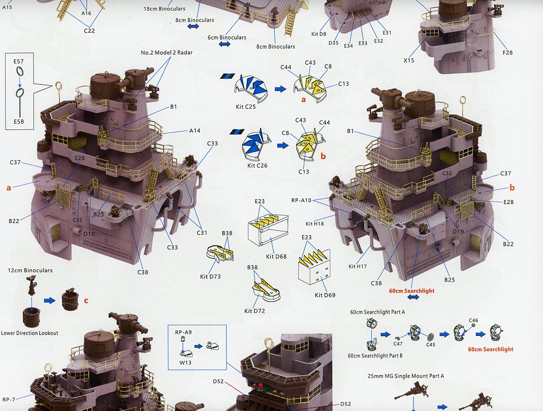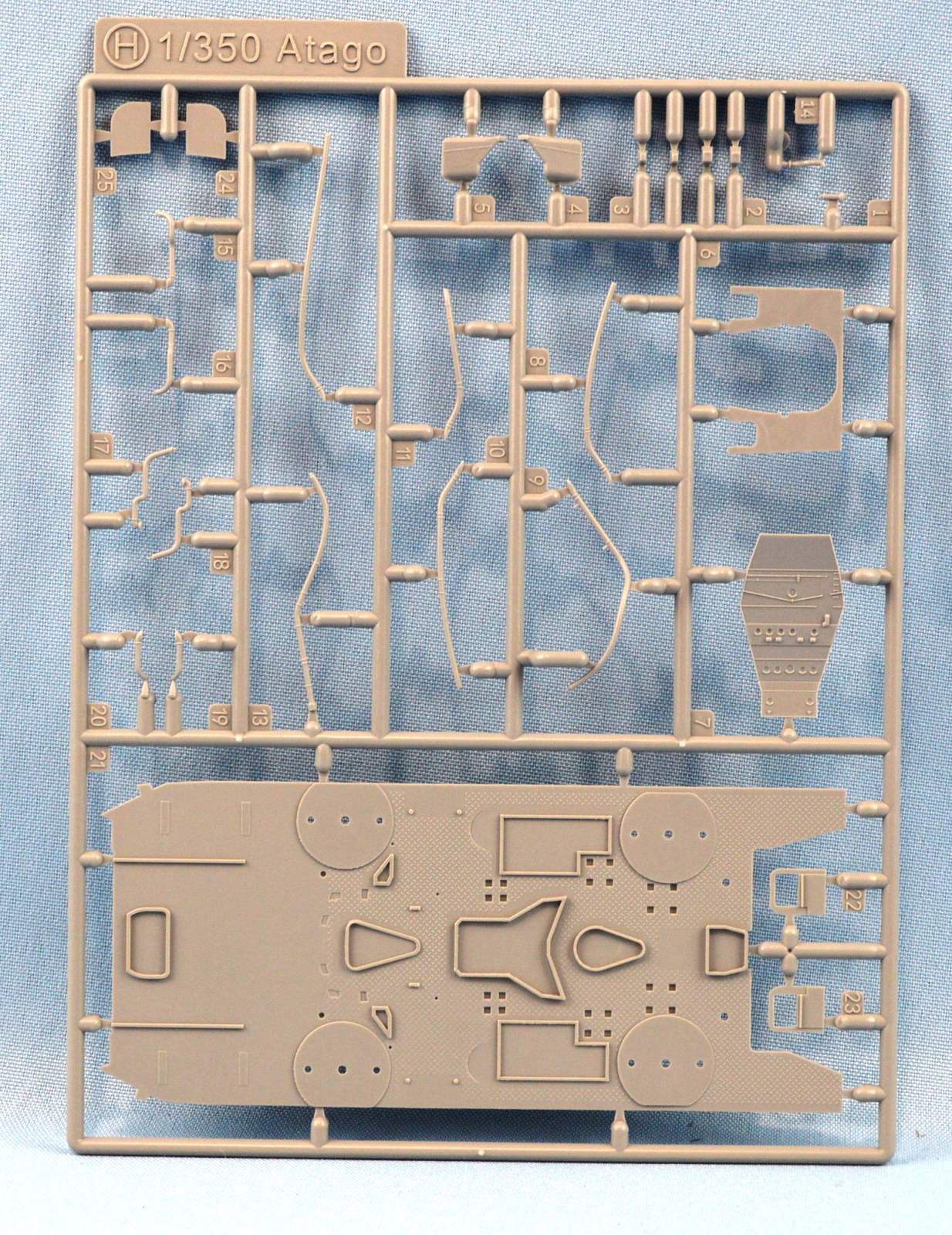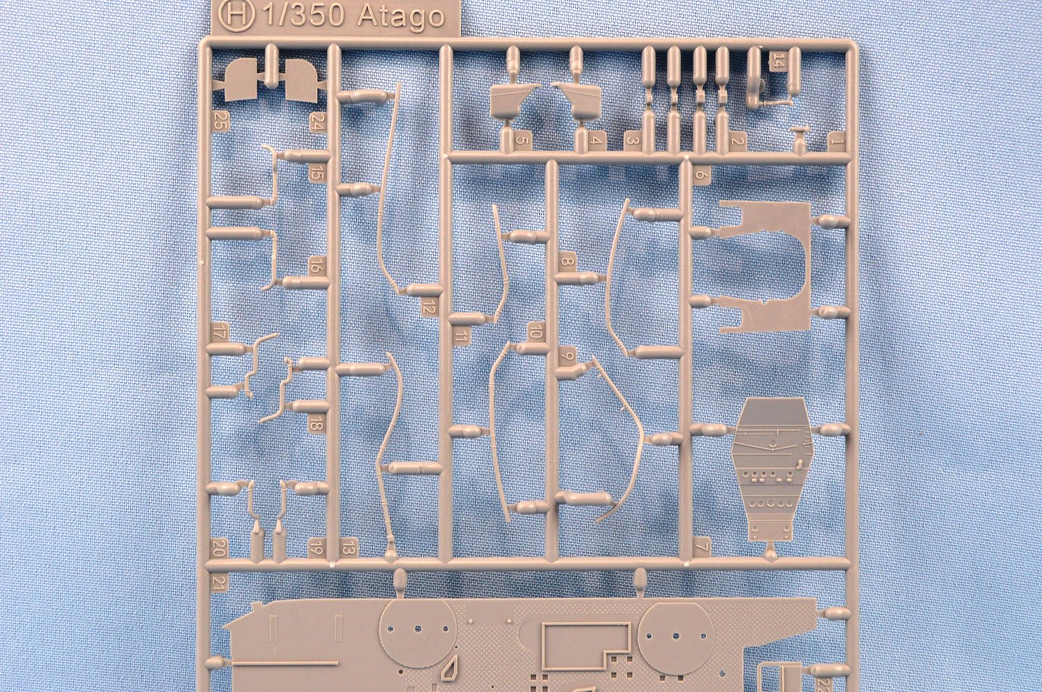 | This is the only Atago specific plastic sprue in the box. On it is the new upper deck, with diamond tread plating detail, the new bridge face, with the correct porthole layout, a revised back of the bridge to accommodate air intake pipes, and new vent cowlings specific to Atago. | ||||||||||