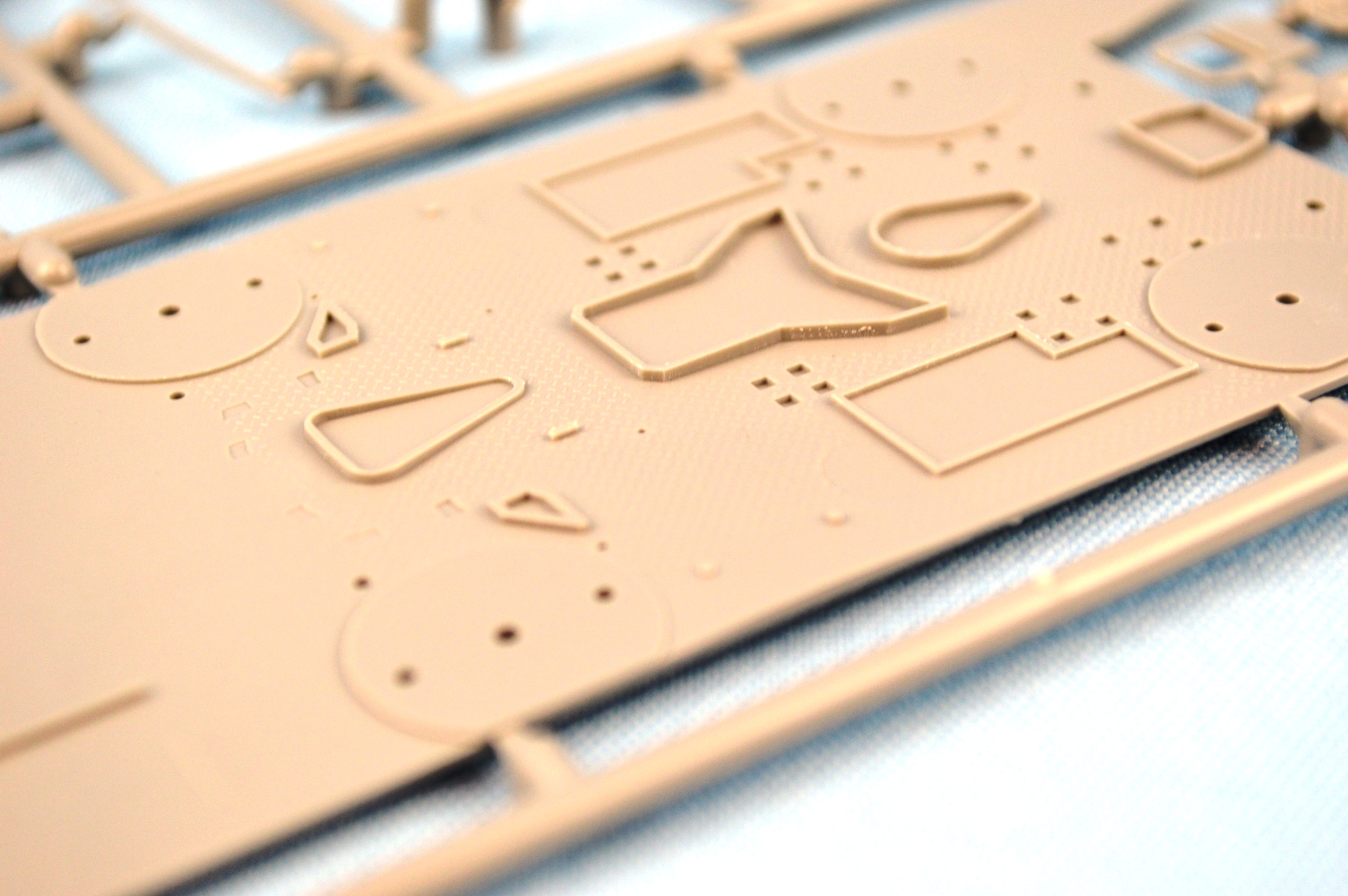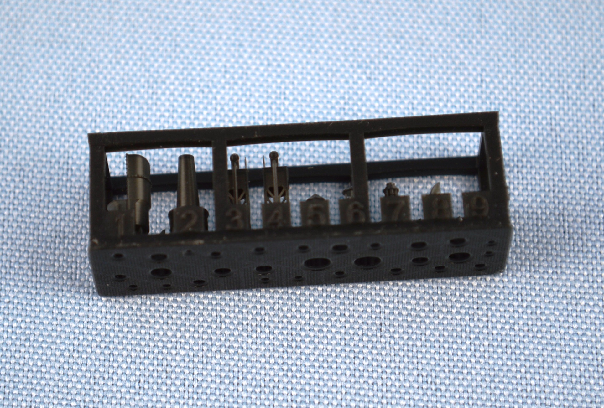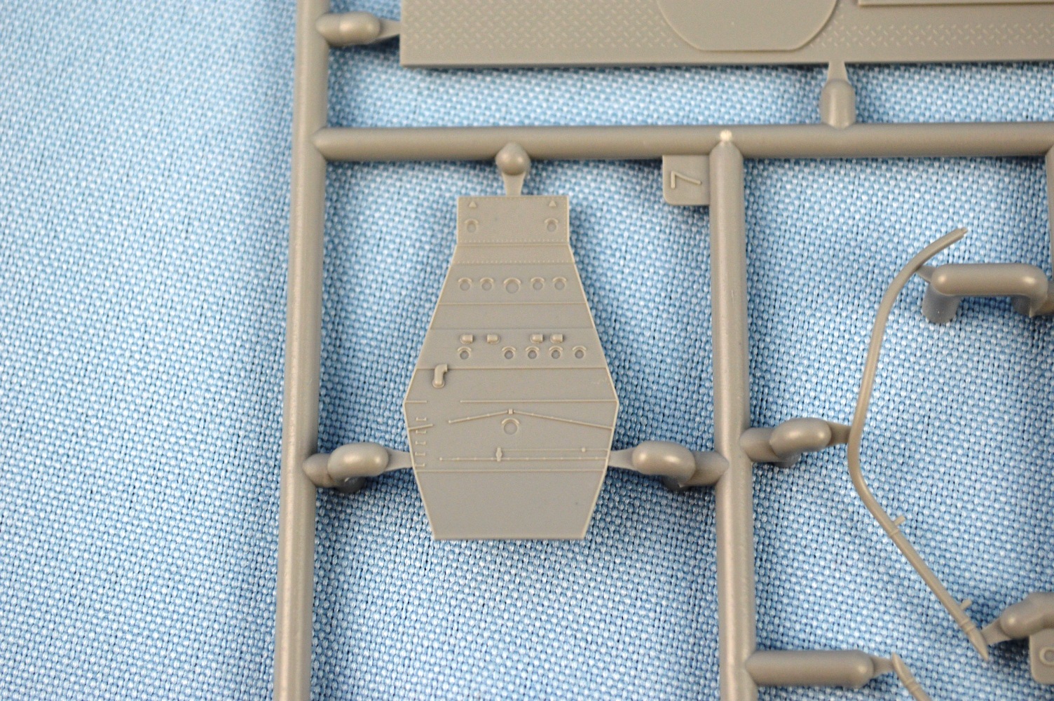 | This is the only Atago specific plastic sprue in the box. On it is the new upper deck, with diamond tread plating detail, the new bridge face, with the correct porthole layout, a revised back of the bridge to accommodate air intake pipes, and new vent cowlings specific to Atago. | ||||||||||