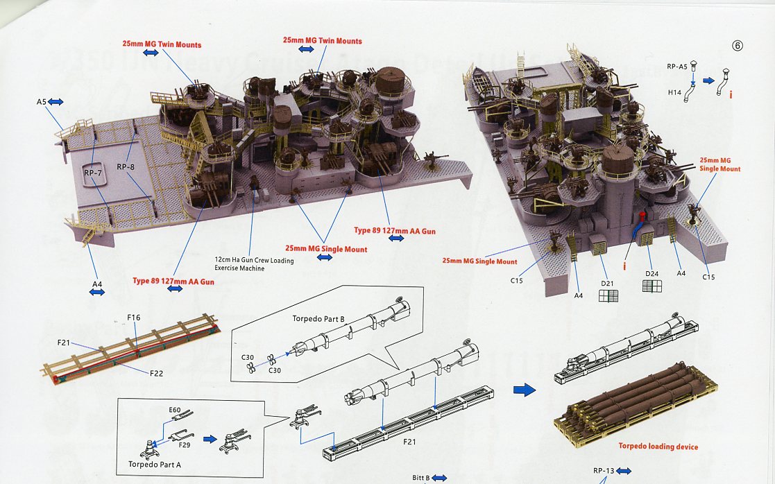There are four print rafts that are either laid out differently or are completely different that Takao, including the front of the bow, where the chrysanthemum emblem sits, a new bridge wind deflector, smoke discharges for the stern and the print raft with the paravanes and some small directors. Print quality is some of the best I've ever seen. |