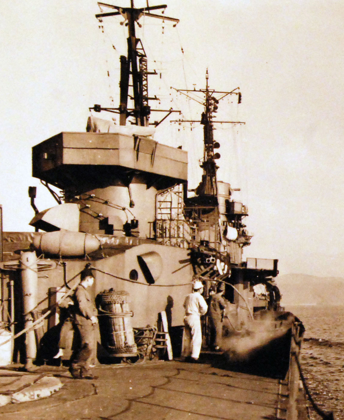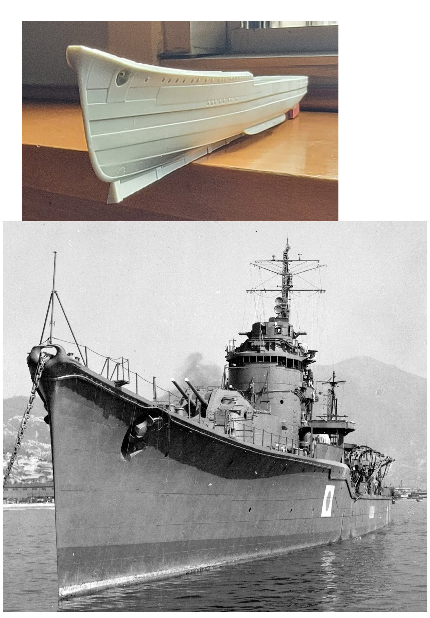Upon her return, she embarked on two convoy missions and was then directed to Rabaul, where she joined the Guadalcanal campaign in late August. Akizuki was attached as an escort to the First Carrier Division (Shokaku, Zuikaku) and participated as such in the Battle of the Eastern Solomons. Afterwards, Akizuki remained officially attached to CarDiv 1 while also running patrols out of Truk and acting as escort for various transport and supply missions in and around the Solomon Islands. At Empress Augusta Bay in late September, she was bombed by B-17s and managed to shoot one down. She was also photographed by another aircraft, revealing the new class of destroyer to the Allies. At the beginning of October, she was assigned to DesDiv 61 in company with her newly commissioned sister ship Terutzuki. Her escort missions to Guadalcanal and surrounding islands continued through mid-October, mostly as an escort for the seaplane carrier Nisshin conducting resupply of heavy arms and men. She also successfully escorted Nisshin and her resupply convoy to Guadalcanal during the Battle for Cape Esperance. Subsequent resupply missions through late October were hard fought and met with mixed success in terms of successful landings and losses. On October 25th, she was part of a gunfire support mission as part of the effort to retake Henderson Field on Guadalcanal. Aircraft from Henderson Field on Guadalcanal attacked the escort group in three waves over several hours. Light cruiser Yura was sunk and Akizuki was damaged by one small hit and two near misses. Her damage was functionally repaired at Rabaul, and she returned to Japan via Truk in company of other units of CarDiv 1. She was fully repaired at Yokosuka Naval Base; those being completed by the end of December 1942. While in dock, an additional triple 25mm AA on a raised bandstand was emplaced to each side of the funnel. Akizuki headed back to Guadalcanal where she resumed a role as escort for more re-supply missions. These new missions were more typically composed of other destroyers and referred to as “Rat Runs” by the Japanese and “the Tokyo Express” by the Americans. While responding to a distress call from a cargo ship on January 19th, Akizuki was hit by two torpedoes from USS Nautilus near the Shortland Islands. One did not explode, but the other blew open the hull under the bridge on the starboard side. The flooding was extensive, knocking out #1 boiler and the starboard engine room. The hit also severely strained the keel under the impact point. 14 men were killed and 63 injured. Gingerly, she made it back to the Shortlands for temporary repairs to shore up the keel. She eventually reached Truk and the repair ship Akashi. Akashi managed to make her serviceable for the trip back to Japan via Saipan. She departed Saipan on March 14th, but 40 miles outside the harbor, the bow sagged severely. Fearful of the bow completely breaking off, Akizuki stopped her engines and was towed back to Saipan, where she was temporarily beached. The salvage ship Matsunouri Maru effected a more radical repair. The bridge and forward two turrets were removed to lighten the ship. These were transported separately back to Japan. The weakened bow was then severed and replaced by a temporary bow. A temporary bridge was erected aft the main mast and Akizuki was towed back to Japan in this condition by the auxiliary minelayer Shinko Maru, arriving in very early July 1943. She entered drydock at Mitsubishi’s Nagasaki Shipyard and remained there until late October 1943. This Mitsubishi facility was responsible for the construction of five of the initial seven Akizuki class ships, and it was here that the decision was made to transplant the bow of the recently launched but still incomplete sister ship Shimotsuki to expedite Akizuki’s repair. (This course of action is indicative of how highly regarded these ships were. Surprisingly, the severing and rebuilding of Shimotsuki’s bow does not seem to have delayed her overall construction time. Shimotsuki was completed in March 1944, well within the wartime norm of 21+ months total construction time.) While under repair, Akizuki gained additional 25mm and 13mm AA guns, a Type 21 radar upon the foremast, a Type 93 hydrophone for ASW work, and new roll-off depth charge racks at her stern. Akizuki rejoined DesDiv 61 at the end of the month but spent most of November and December engaged in training and fleet escort missions to Truk, Kwajalein and Kavieng. At Kavieng in early January, she was subject to an Allied air raid that damaged Noshiro, Oyodo and Yamagumo. She returned to Truk and participated in its evacuation in early February, ahead of the Hailstone Operation. She then relocated to the Singapore -Lingga Roads locale where she rejoined the other units of DesDiv 61 and the first Mobile Fleet. There, she and the division began an intensive period of training as AA escorts for the carriers of the fleet. These sessions were interspersed with stints of ASW work and convoy duty. In mid-May, the fleet relocated to Tawi Tawi, where these routines continued. Toward the end of June, the First Mobil Fleet sortied for battle, to oppose the American landings in the Marianas Islands. Akizuki was part of the screen for Force “A” and the three fleet carriers of CarDiv1. Akizuki fought hard along with the other escorts but, the battle went very badly for the Japanese and Force “A” lost the carriers Taiho and Shokaku. Another Carrier from Force “B:” was lost as well. Akizuki escorted the surviving units, including carrier Zuikaku, back to the mainland. Maintenance and training in Japanese home waters occupied the next three months. In early October, Akizuki underwent a refit, then rejoined DesDiv 61 as they escorted the remaining carriers of the Japanese fleet into battle off the Philippines in late October. At the Battle of Cape Engano, Akizuki was screening carriers Zuikaku