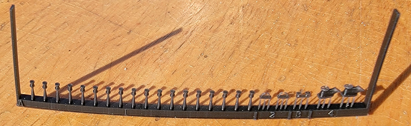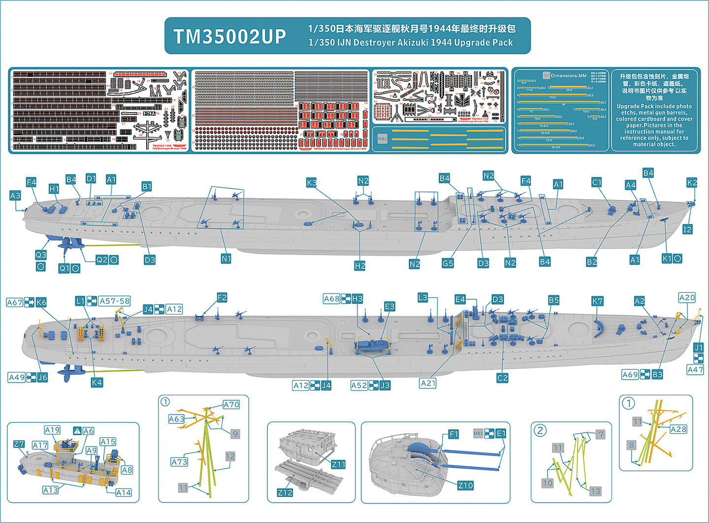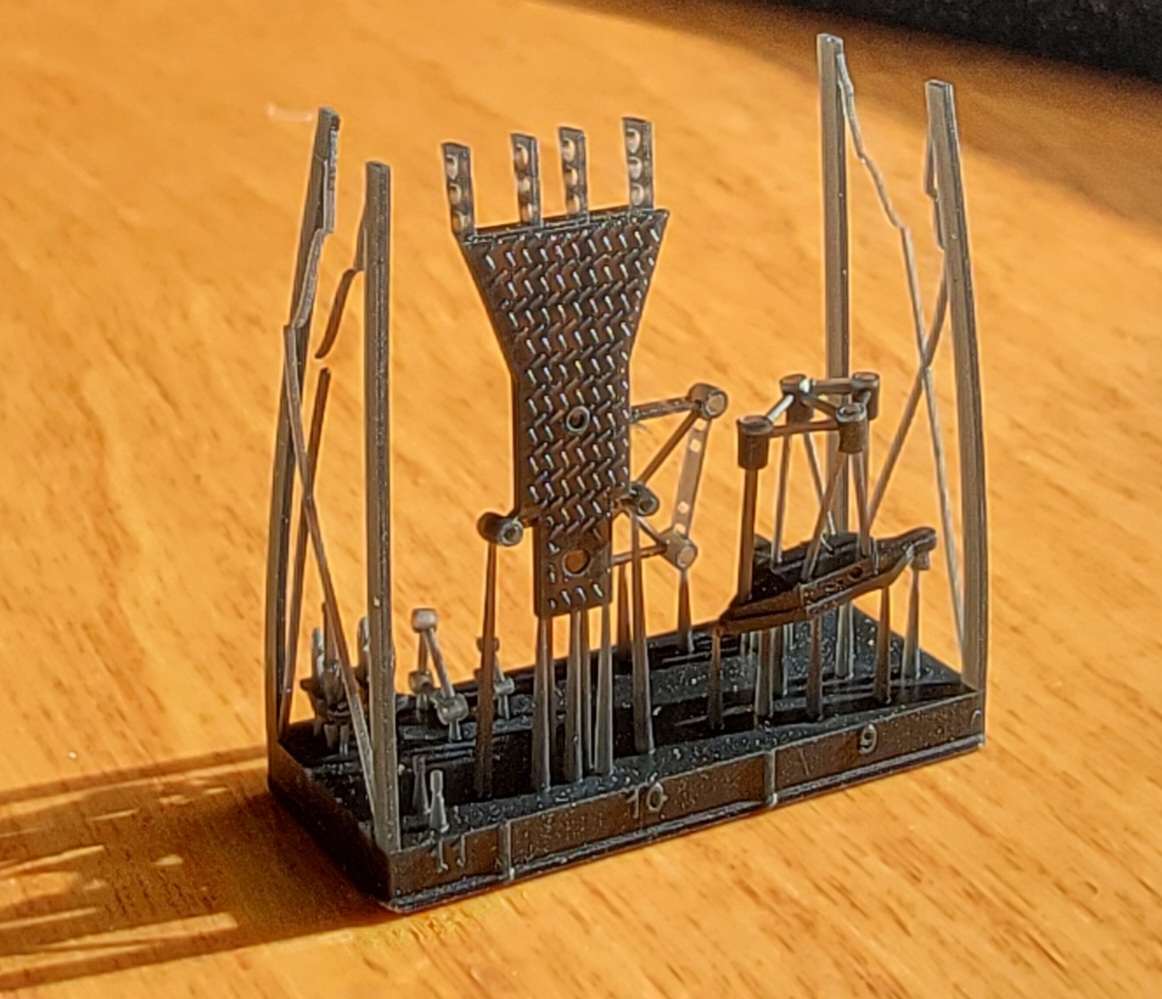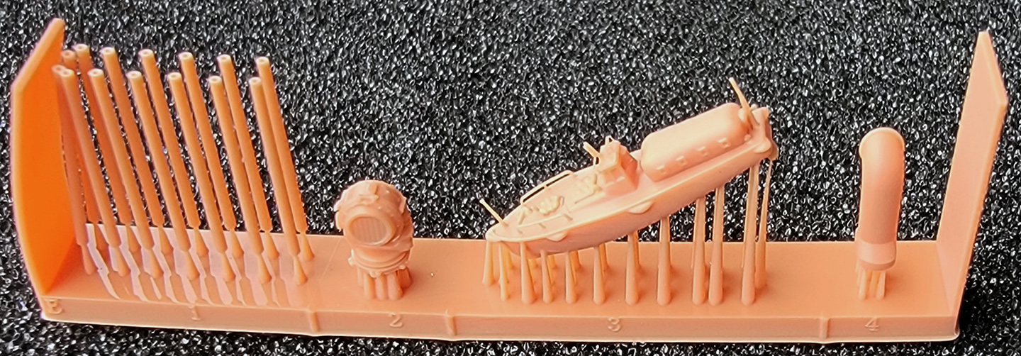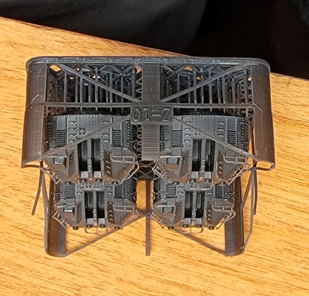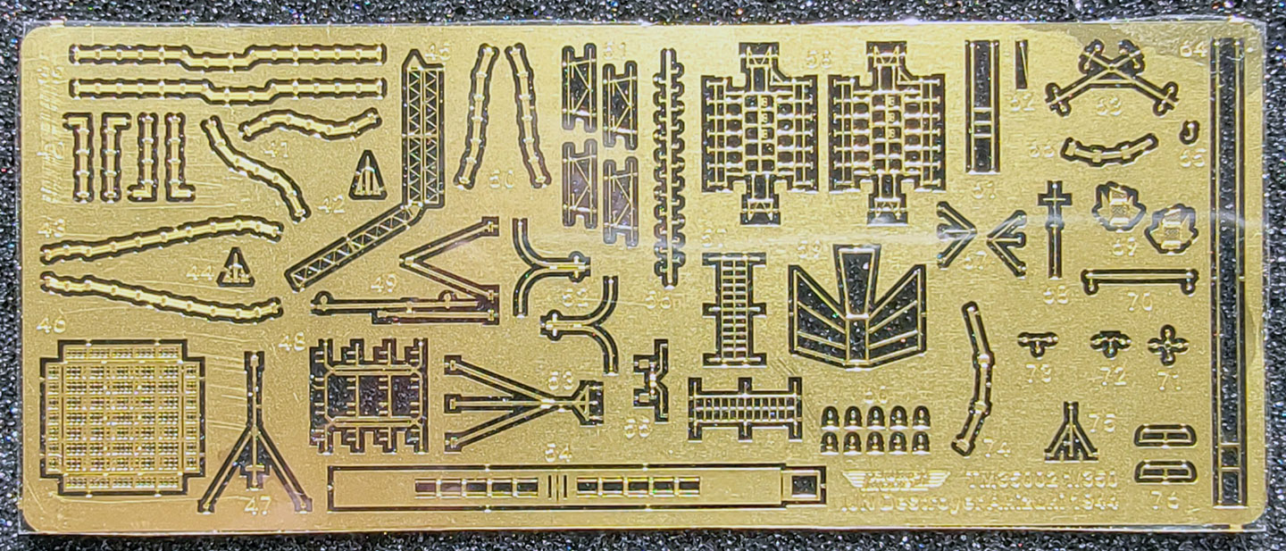 ·A – bollards, bow and stern fairleads, two hawsepipe covers with handwheel brakes ·B – several sizes of deck hatches, a large bitt, and small mushroom deck vents ·C – capstan and handbrake wheel, ammo boxes, torpedo handling davit, deck winch ·D – Depth charges, bumpers in cages, hawser reels. ·E – holds 3D printed main barrels, 90cm searchlight, one 9m motor launch and a large gooseneck intake. The marketing photos show this raft printed in black. I don’t know why it’s been printed in orange here. ·F – Sleeves for 10cm barrels, torpedo trolley, deck vents, gooseneck vent ·G - binoculars, 3m rangefinder, 13mmm MG ·H – deck hatches, boat cradles, bridge antenna base, speaking tubes, gooseneck vents, support for galley pipe, small access ladder, helm and compass binnacle, searchlight director, RDF antenna ·I – life rings, fairleads, small reels, 25mm AA ammo boxes ·J – fore and aft jackstaffs, antenna tripod, davits (boat, torpedo & depth charge loading), aux, generator exhaust pipes ·K – wave break fairing, propeller guards, torpedo reload gantry vertical support, Y-guns, engine room hatches, bullnose, anchors ·L - depth charge racks, Type 21 radar and extra base, gooseneck air intakes, vegetable locker ·M – triple 25mm AA mounts ·N – single 25mm AA with small and large round bases ·N2 - single 25mm AA with large round bases ·O - compass bridge deck extension plus component sections and braces for the foremast, plus more anchors. These components require lengths of brass rod for the legs of the mast and assembly is covered only in the deluxe upgrade instructions. Otherwise, see raft Z14 below. · Q - anchors, rudder, props, prop shaft brackets ·R – Two types of deck hatches, I think. However, the instructions do not list any hatches from a raft labeled “R”, only “H”. Possible erroneous lettering. ·Z3 – roof for bridge, with integrated wind vanes. ·Z4 – base for Type 94 High Angle director atop the bridge ·Z5 – Type 94 High Angle director (main gun director) ·Z8 – 25mm AA platforms for both sides of funnel ·Z9 – central 25mm AA bandstand and RDF/searchlight platform with integrated vents and RDF compartment ·Z10 – enclosed 10cm main battery turrets (four) ·Z11- Type 92 mod 4 torpedo tube mount shield (one) ·Z12 – quadruple Type 92 torpedo tube mount (one) ·Z13 – one piece printed main mast with Type 22 radar attached (hard to see inside its raft) ·Z14 – one piece printed foremast (also hard to see inside its raft) ·Z15 – overhead torpedo reload gantry girder (paired with a vertical support on raft K) Surprisingly, no printed anchor chain is included with the kit, unlike the previous Mutsuki kit. So, the modeler will need to obtain some chain. |