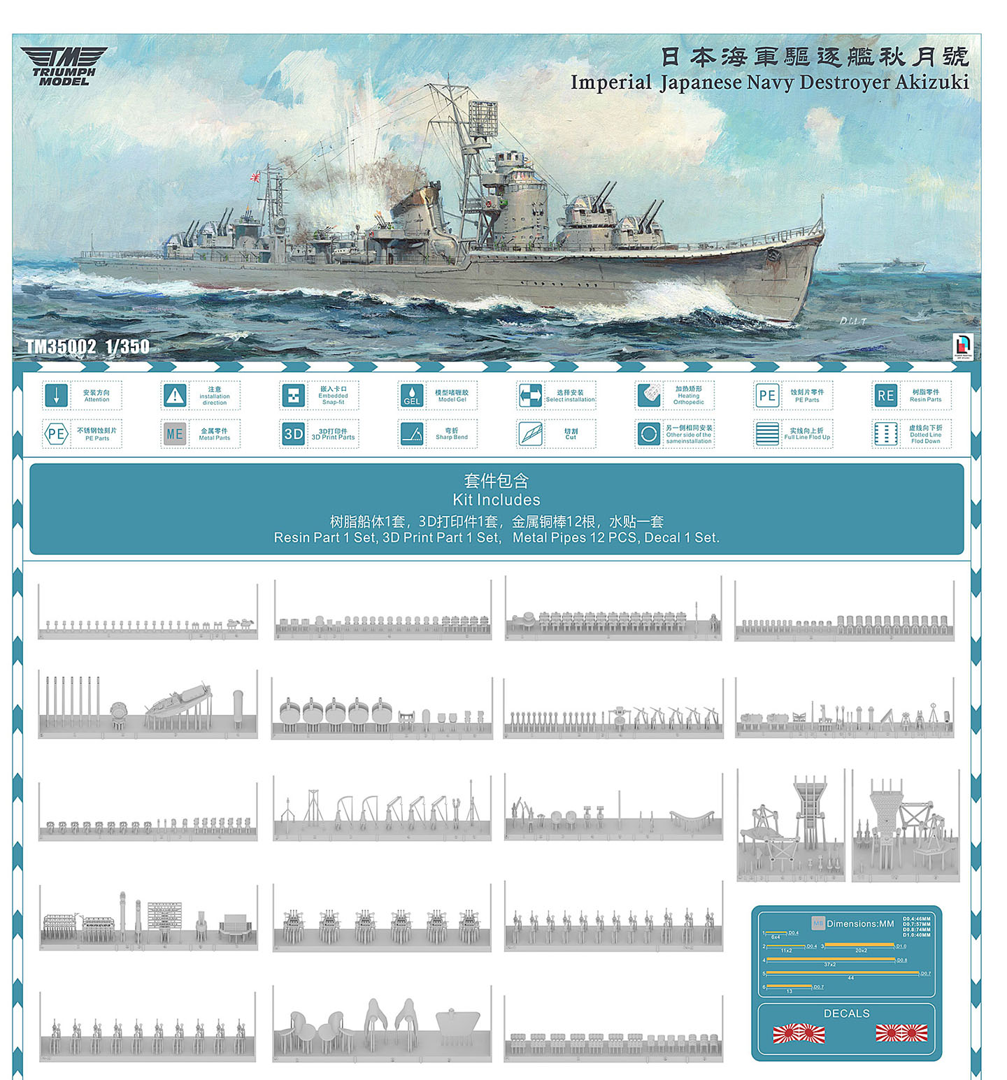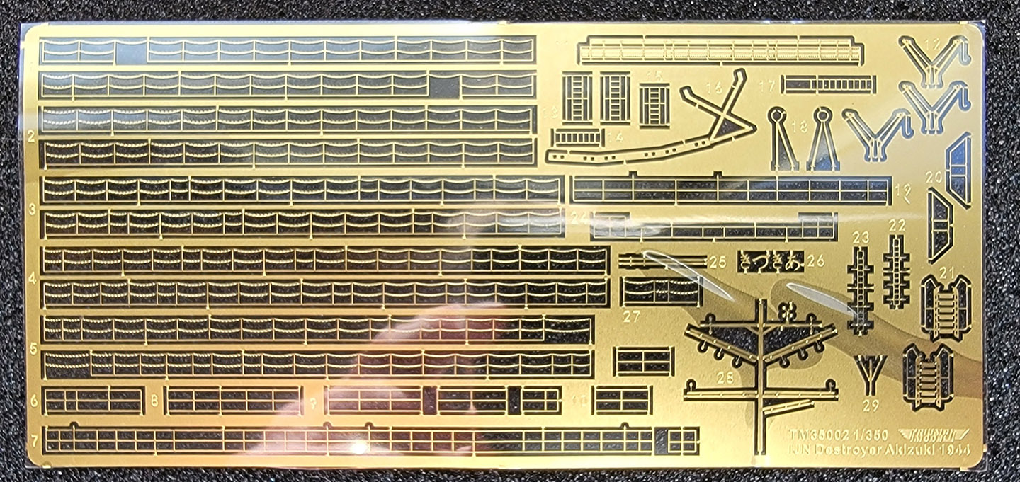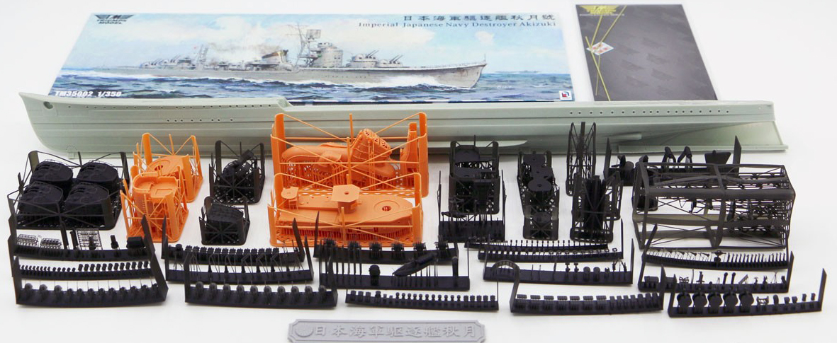 Triumph has simplified its offerings as compared to its recently released Mutsuki kit. Whereas that kit offered four options: waterline or full hull, standard or deluxe, the Akizuki kit comes only as a waterline or full hull kit. A deluxe upgrade package containing three sheets of photo etch parts, turned brass barrels, and a deck mask for painting is available for separate purchase and can be used with either version. This review kit consists of the standard full hull kit and the deluxe upgrade package. The kit hull is cast a very light grey resin. Everything else in the standard kit is a 3D printed part. The basic kit also comes with brass rods for masts and prop shafts (for the full hull version), plus flag decals. There are thirty-two print rafts; numerous smaller parts are contained on twenty-four rafts printed in black while four larger rafts containing superstructural items are printed in orange. Oddly, one of the smaller parts is printed in orange. Also included is a 3D printed nameplate. The kit art and contents are appropriate for Akizuki, late 1944. This same configuration would also be appropriate for sisters Hatsuzuki, Wakatsuki and Shimotsuki in 1944, excepting some placements of the single 25mm AA mounts. |