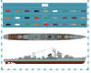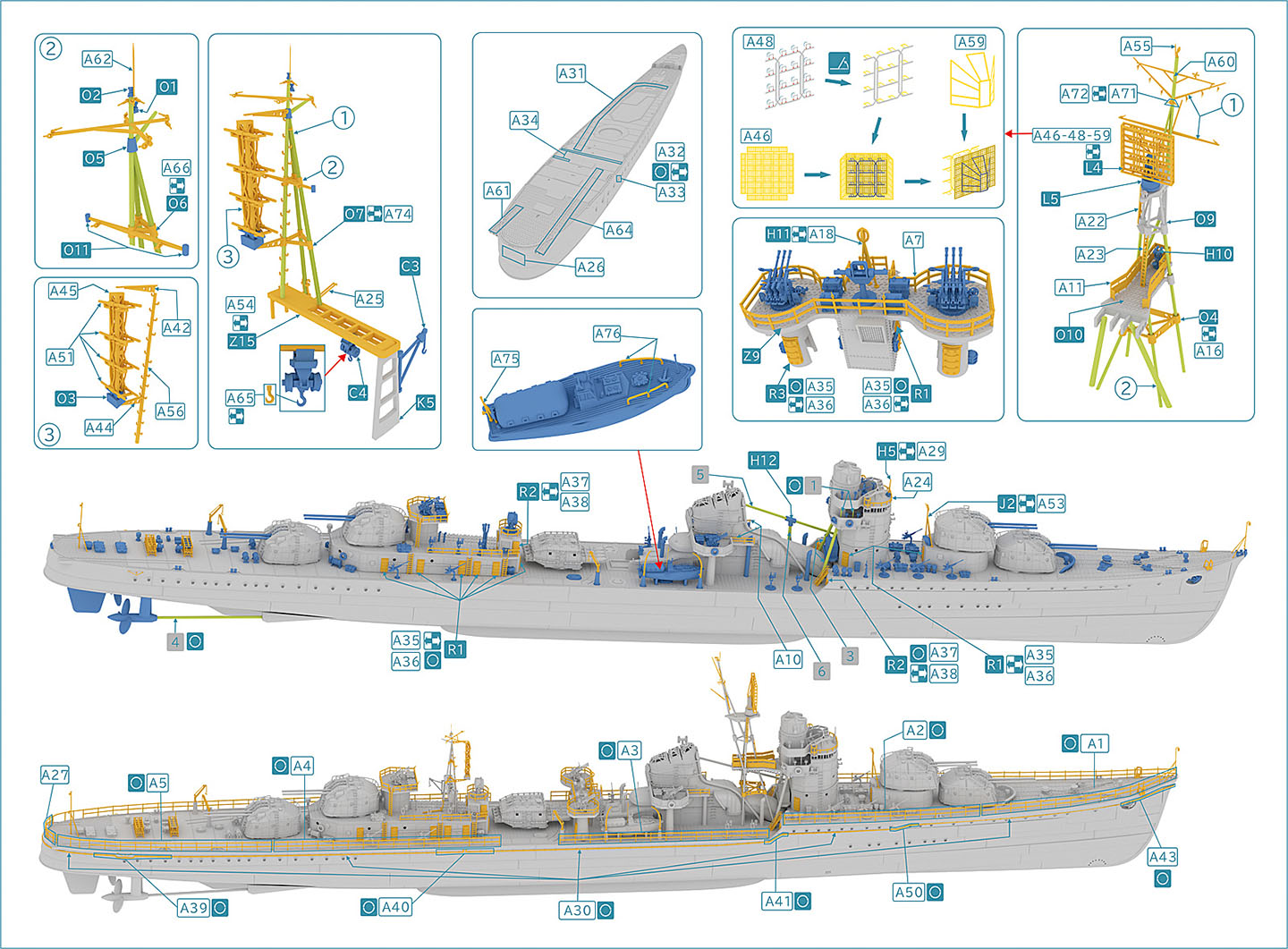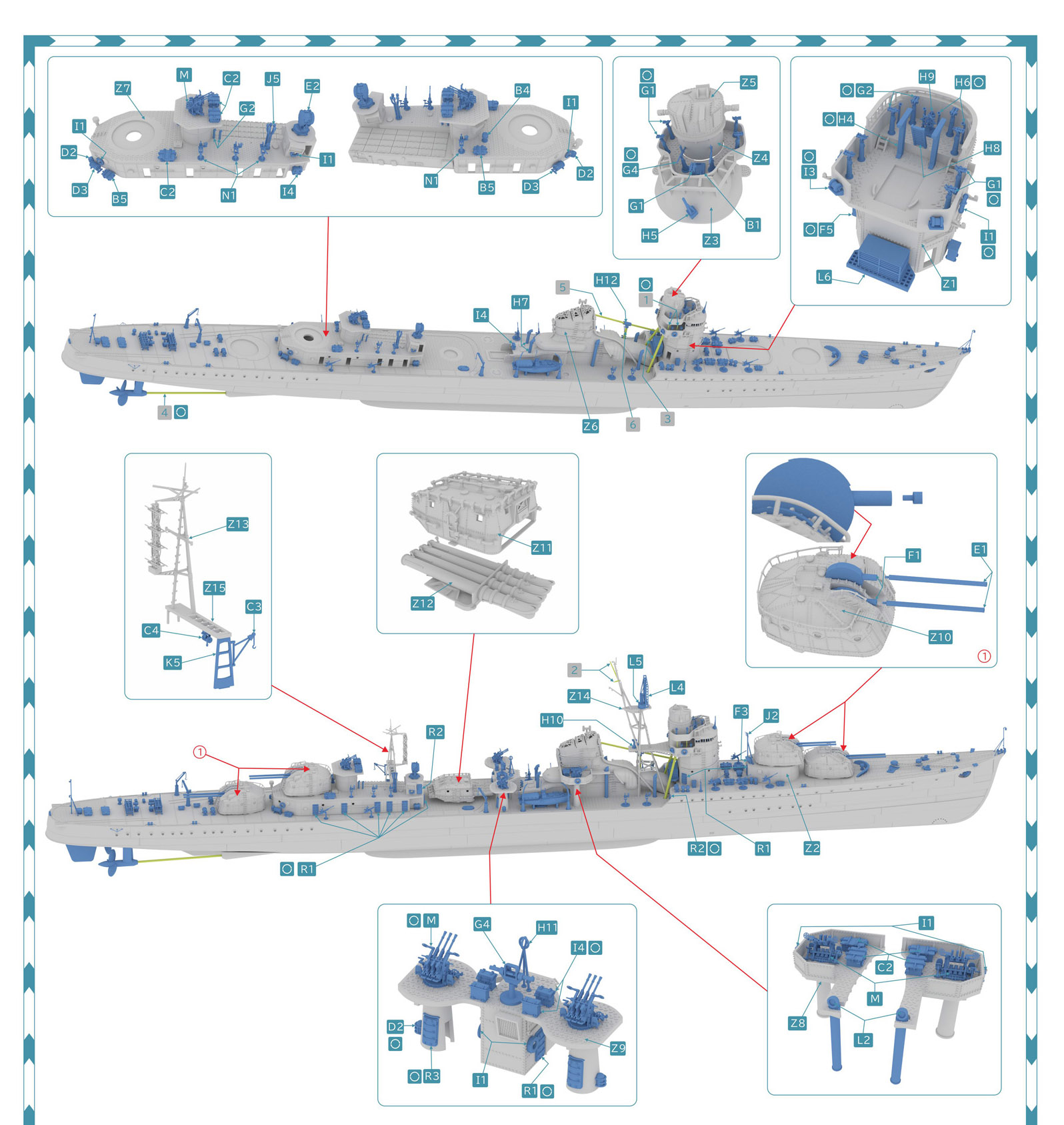 ·Z2 – raised mount for superimposed #2 main battery turret ·Z6 – funnel and housings. Two parts. ·Z7- aft deckhouse/torpedo reload storage bays, with AA and searchlight platforms |