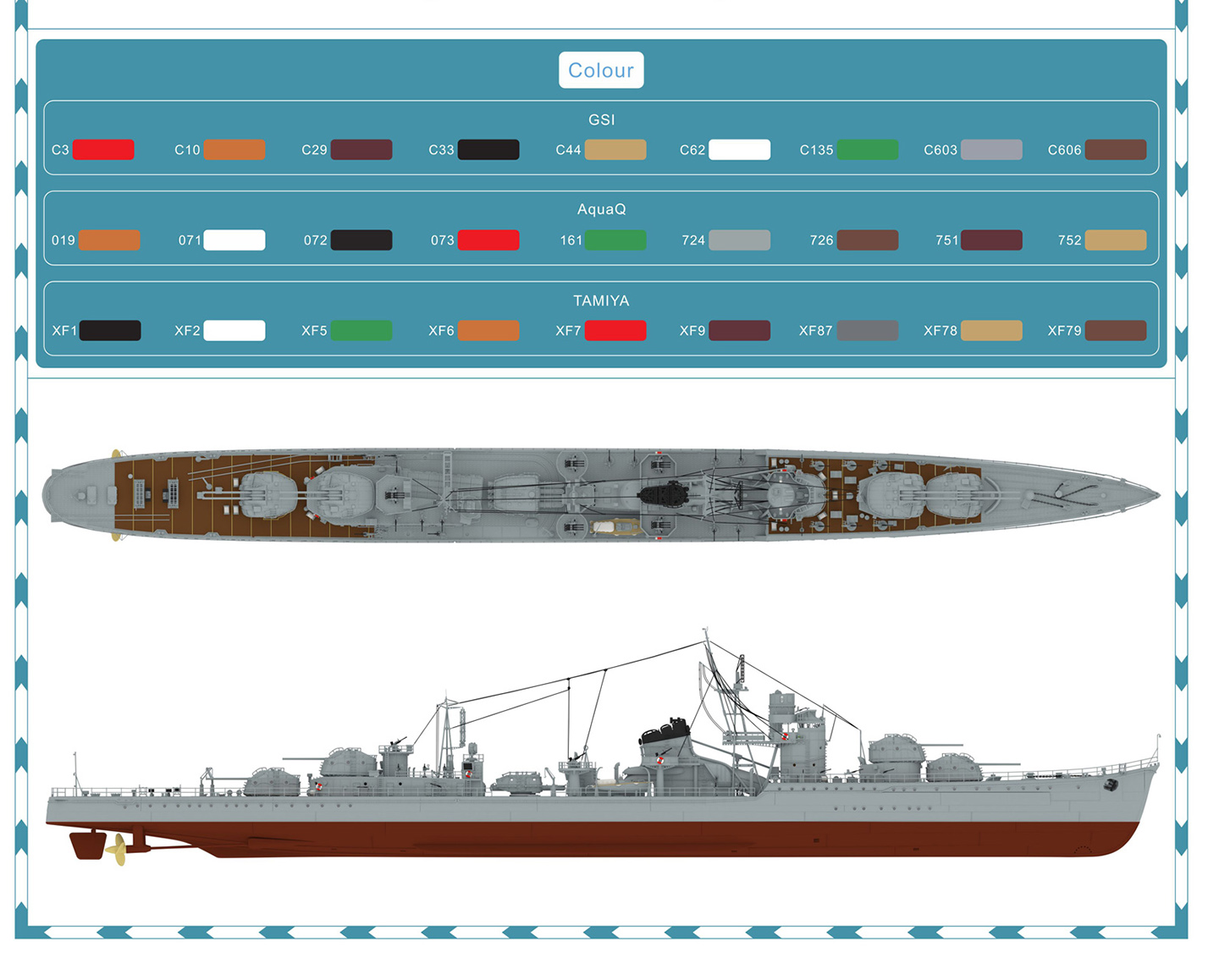 The images of the print rafts on the parts manifest do not show numbers or letters, despite the actual rafts containing such identifiers. The modeler will have to eyeball the actual 3D printed parts carefully against the instructions because the raft numbers are small and difficult to see, particularly those in black with a black background. The bottom of the front sheet displays 3-point perspective images of the standard kit, depicting placement of all the various printed pieces in blue color against the gray hull. Additional steps are carried over onto the back of the sheet. This applies to the construction of substructures as well. The instructions seem somewhat incomplete. For instance, nowhere is it indicated that the compass bridge deck roof is placed on top of the bridge except for the last image, which shows it already in place as part of the whole bridge. The same holds true for the two-part funnel/vent assembly and the foremast. Also included on the back sheet is a color plate with the ship’s color scheme in 1944. Colors are keyed to three different paint suppliers, GSI, AquaQ and Tamiya, but there is no direct linking of a paint color with a specific ship color. The modeler is left to match colors via the Mk. 1 eyeball. |