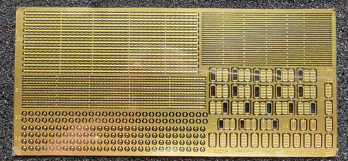 Fret 1 contains all the railings for the ship, numerous access ladders, foremast cross-brace, depth charge handling davits, foremast top and yardarms, and hiragana lettering for the stern spelling Akizuki Fret 2 holds numerous parts for a degaussing cable, watertight doors and frames, porthole rims with eyebrows and porthole covers, and what I believe to be brass tie-down strips for the linoleum decking. Fret 3 holds more parts to the degaussing cable, the components of the Type 21 and Type 22 radars, RDF antenna, jackstaffs, boat davits, depth charge racks, the upper portion of the torpedo reload gantry, radio antenna tripod, and few smaller items. |