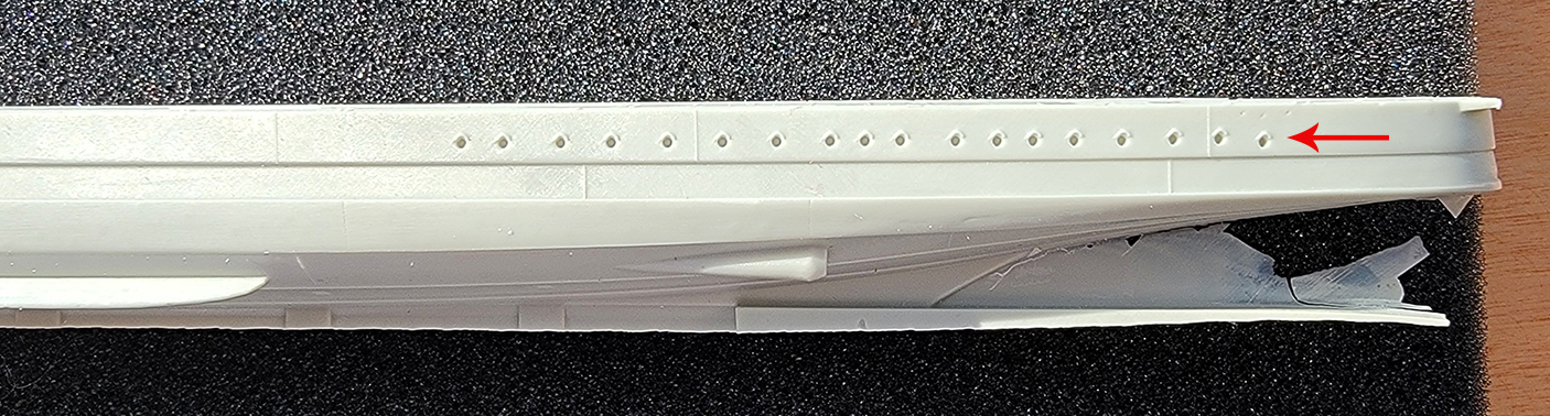 The casting is extremely sharp, with hawse pipes and recesses for the anchors, hull plating, portholes and eyebrows, hull mounted sonar, water intake grills, bilge keels, propeller shaft glands, and placement recesses for the prop shaft brackets and rudder. The forecastle and main decks come with treading, molded brass tie-down strips for the linoleum covered areas, spurnwaters, torpedo trolley and roll-off depth charge rails, extensions at the stern for those roll-off depth charge racks, and recesses for superstructure and equipment placements. The edges of the forecastle deck are properly turtle-backed in shape. All the details are very sharply molded, and as with the Mutsuki kit, I’m very impressed by the quality of the casting. Unfortunately, the hull is far from being issue-free. Firstly, there’s overstated plating. It’s undeniably overscale and a comparison of the kit hull with a photo of class sister Yoizuki lays this out clearly. The leading edge of the bow in profile is also somewhat incorrect. The actual bow angled upwards at in a straight line from the waterline, with a minor curve into the area of the bullnose. There’s more curvature in the kit bow than called for, mostly as it approaches the waterline. There are issues with the portholes as well. At the stern, what should be a completely horizontal line of portholes suddenly shifts downward for the last porthole or two. This is the location of the aft crew quarters, where one can be assured that portholes were not installed at knee height. Nor should many of these portholes be open for 1944. The omission means that one must source some porthole covers from either the deluxe upgrade kit, another aftermarket set, or make them oneself. The hull also lacks a degaussing cable. This class was solely of wartime construction, which means that all ships came equipped with a degaussing cable from their outset. Both covers and cable are part of the deluxe upgrade package but having to pay extra for these details seems a little high-handed to me. I don’t consider either omission just the concern of a rivet-counter, and it’s kind of irksome. I mean, it’s a 1944 fit, and these details were part of the general fit. There should be nothing to upgrade to. Perhaps the worst hull error has to do with the decking. There are areas aft on the main deck where the treaded metal plating erroneously overlaps with areas of linoleum decking. This is simply bizarre and plainly wrong. It represents a serious lapse in research. In the same vein but less noticeable is the area of treading behind the wave break fairing on the forecastle deck. There was none in that location. These errors are highlighted in the close-up photographs. The kit hull dimensions are slightly under scale. The forecastle is
