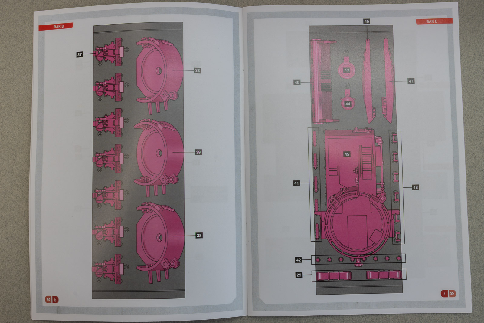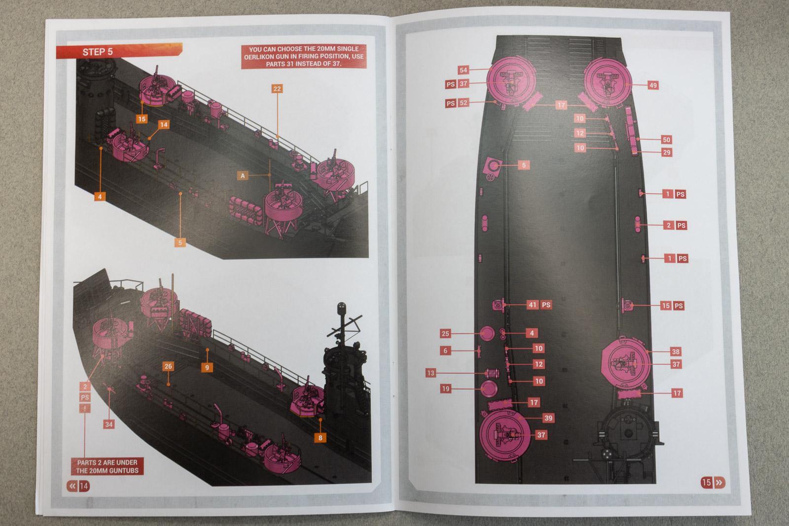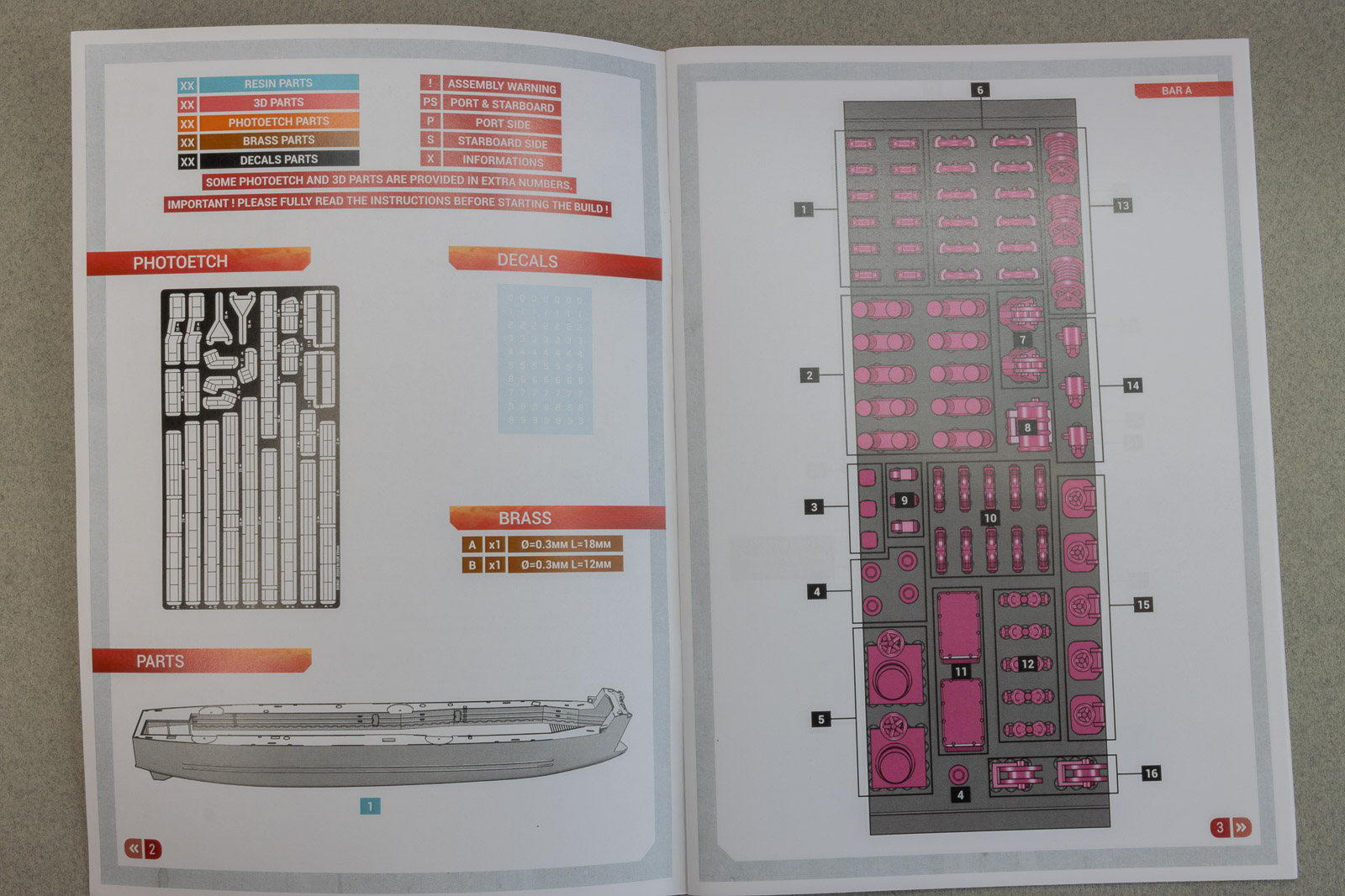 color code: 3D parts are in red, PE in orange, brass rod in brown, decals