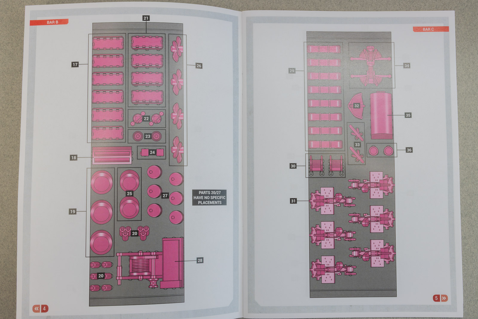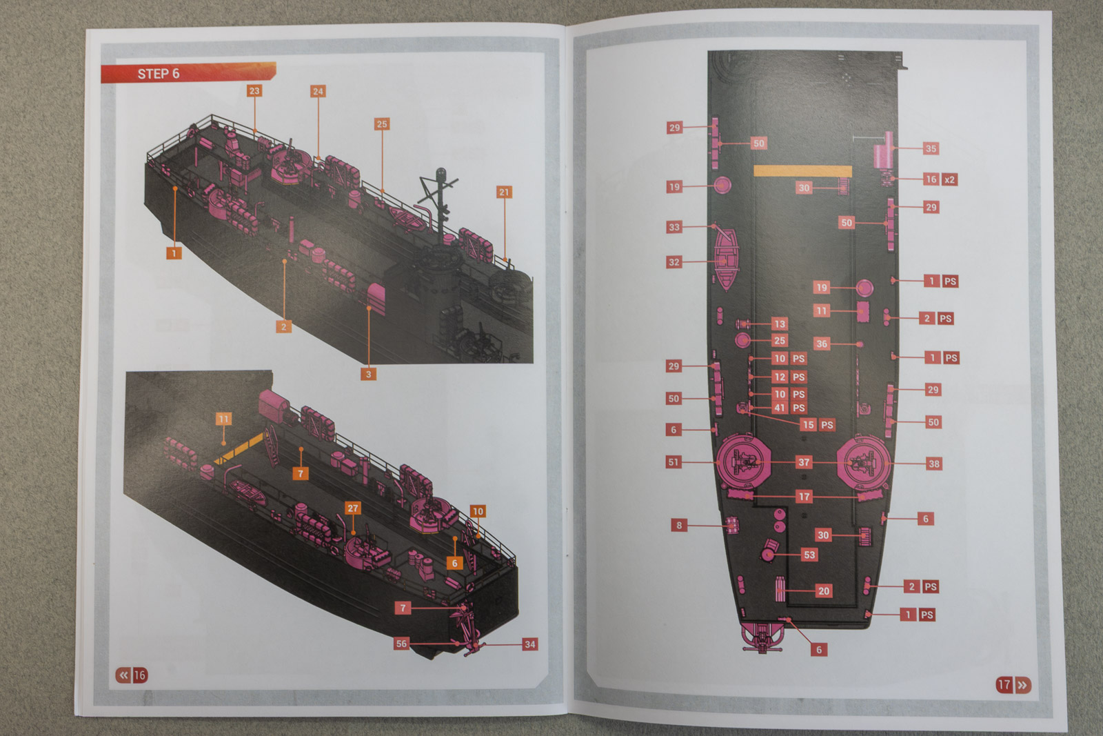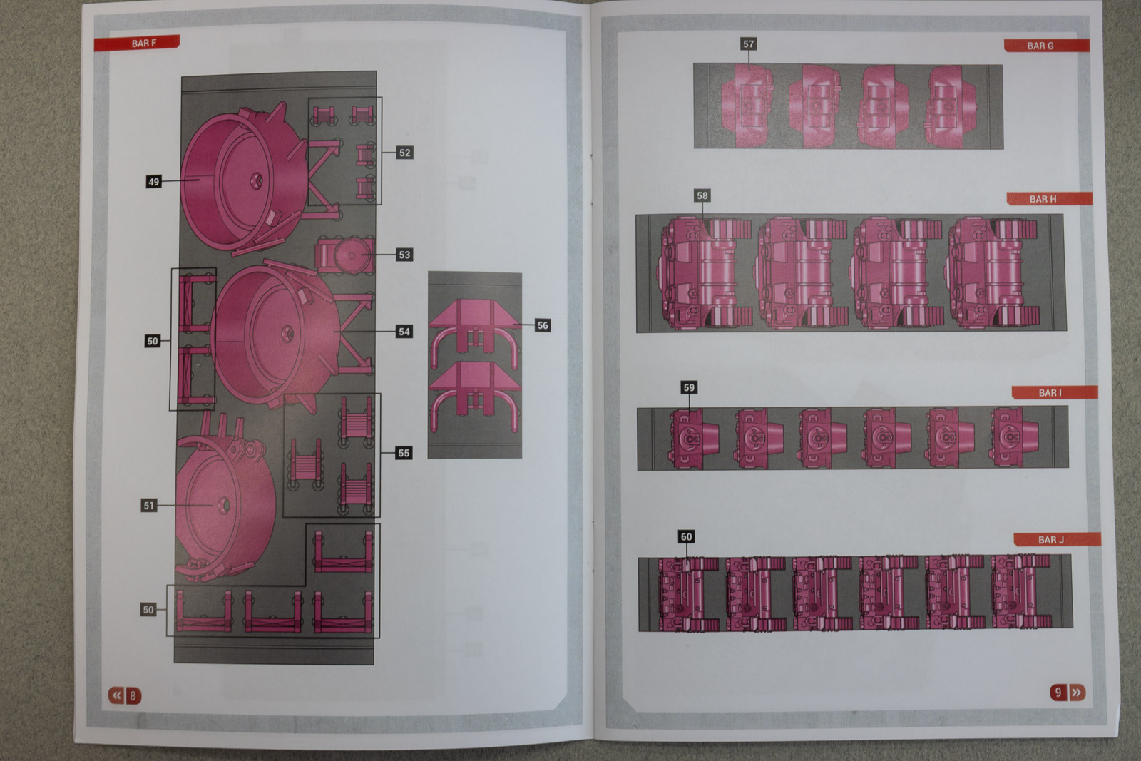 color code: 3D parts are in red, PE in orange, brass rod in brown, decals