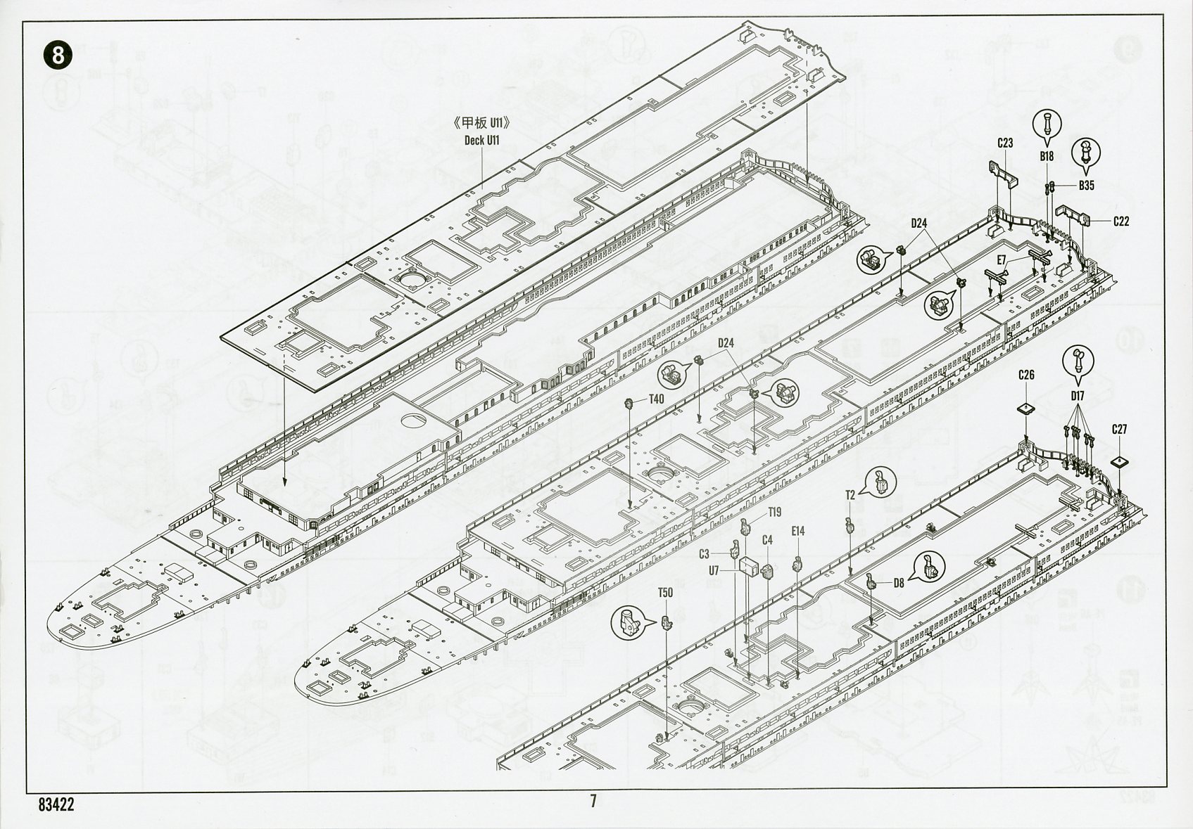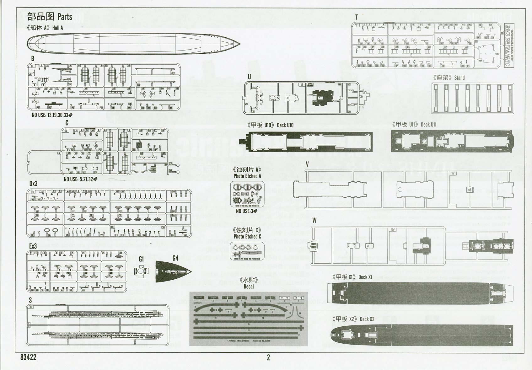The instructions are in the typical Trumpeter/Hobby Boss style: booklet form with exploded view drawings. If you've built a Trumpeter/Hobby Boss kit before, you know what to expect. There is a color profile of the ship included as well, with the color callouts for matching paints from a variety of manufacturers, including Mr. Hobby, Valejo, Tamiya and Humbrol. |