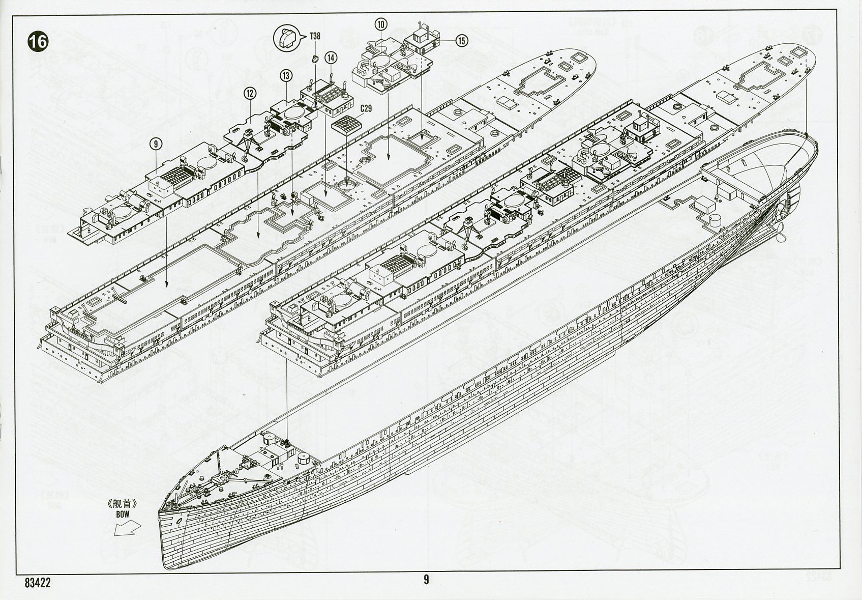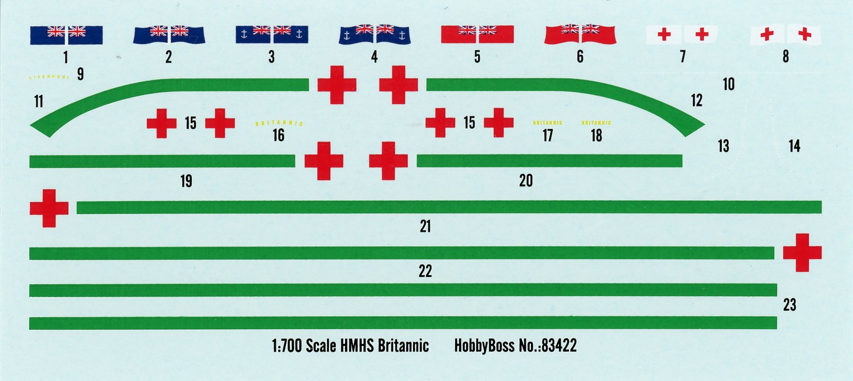 The Hobby Boss Britannic The Hobby Boss 1/700 HMS Britannic comes is a sturdy cardboard box. On the box top is a painting of Britannic at sea. The model is supposed to represent Britannic as a hospital ship, wearing overall white with red crosses and bold green lines on her hull. Inside the box are 21 sprues, a stand, two small photo-etch frets, and decals. Many of the sprues are marked "Titanic", while ten others are specific to this version of Britannic, and marked as such. This kit shares the following spures with the previously reviewed HMT Olympic kit: