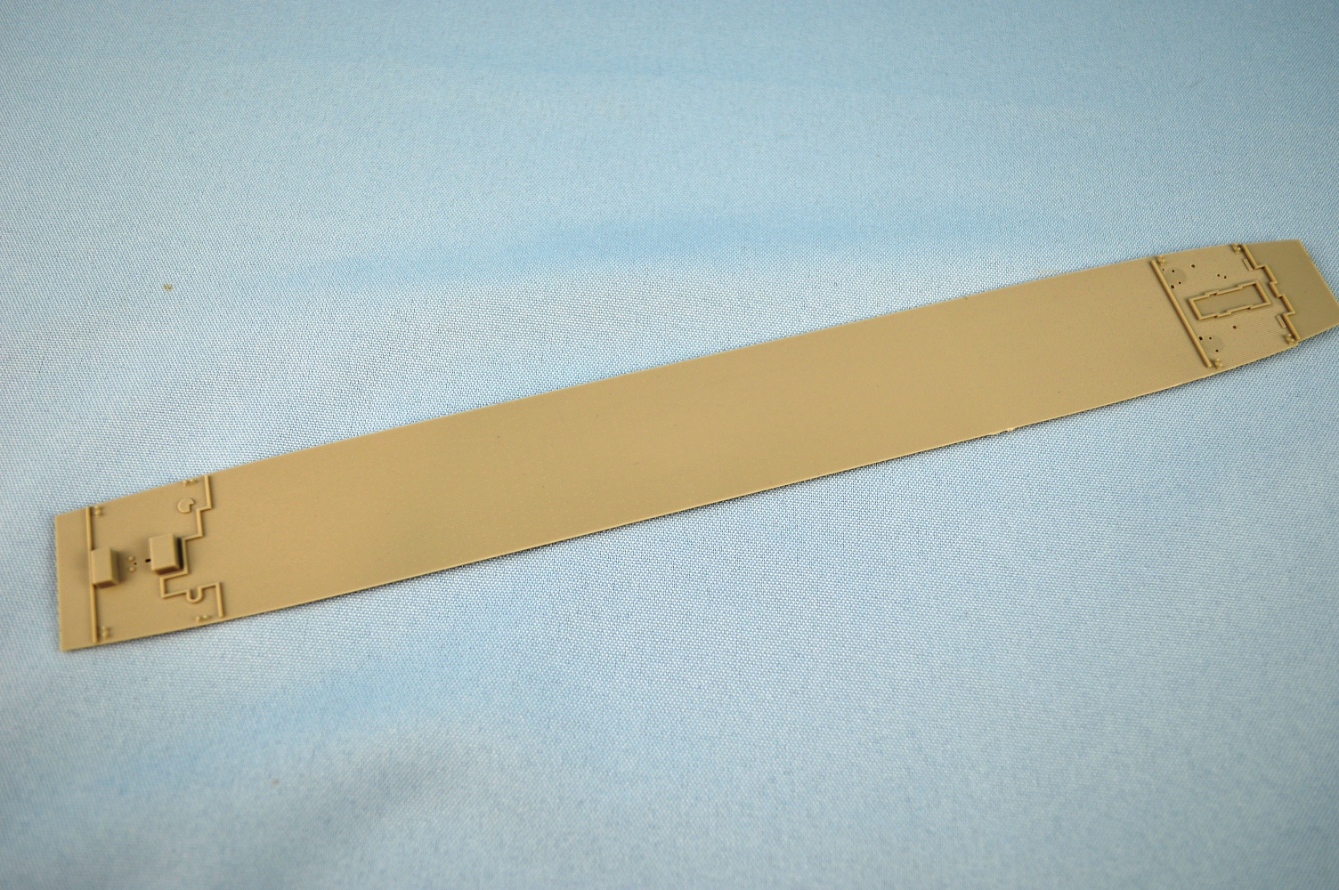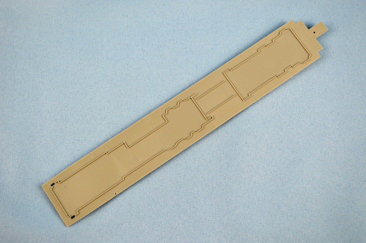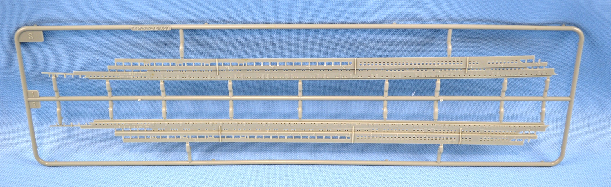 | This sprue contains the sides of the promenade deck. Similar to the previous releases, this sprue is unique to this kit, which was a smart way to engineer the differences between the sisters. There is some nice detail on the sides of the deck, though super detailers might want to remove the molded on davits and add photo-etch replacements. | ||||||||||