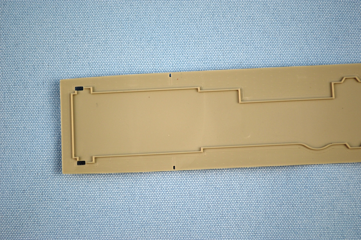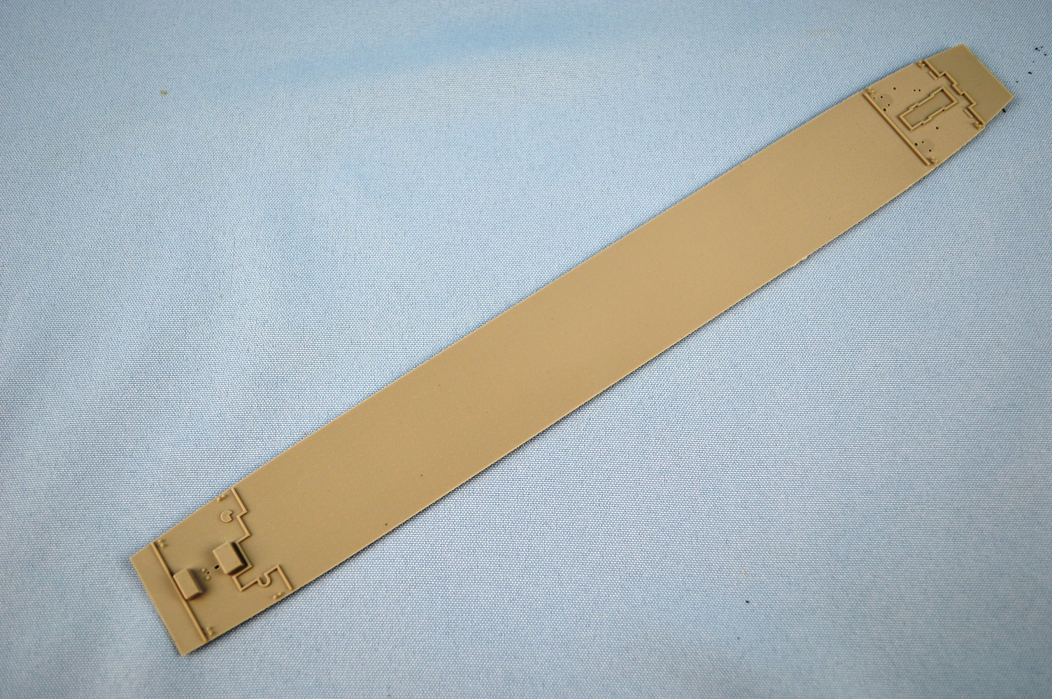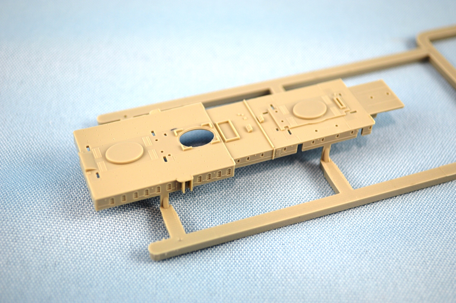 | This sprue contains the sides of the promenade deck. Similar to the previous releases, this sprue is unique to this kit, which was a smart way to engineer the differences between the sisters. There is some nice detail on the sides of the deck, though super detailers might want to remove the molded on davits and add photo-etch replacements. | ||||||||||