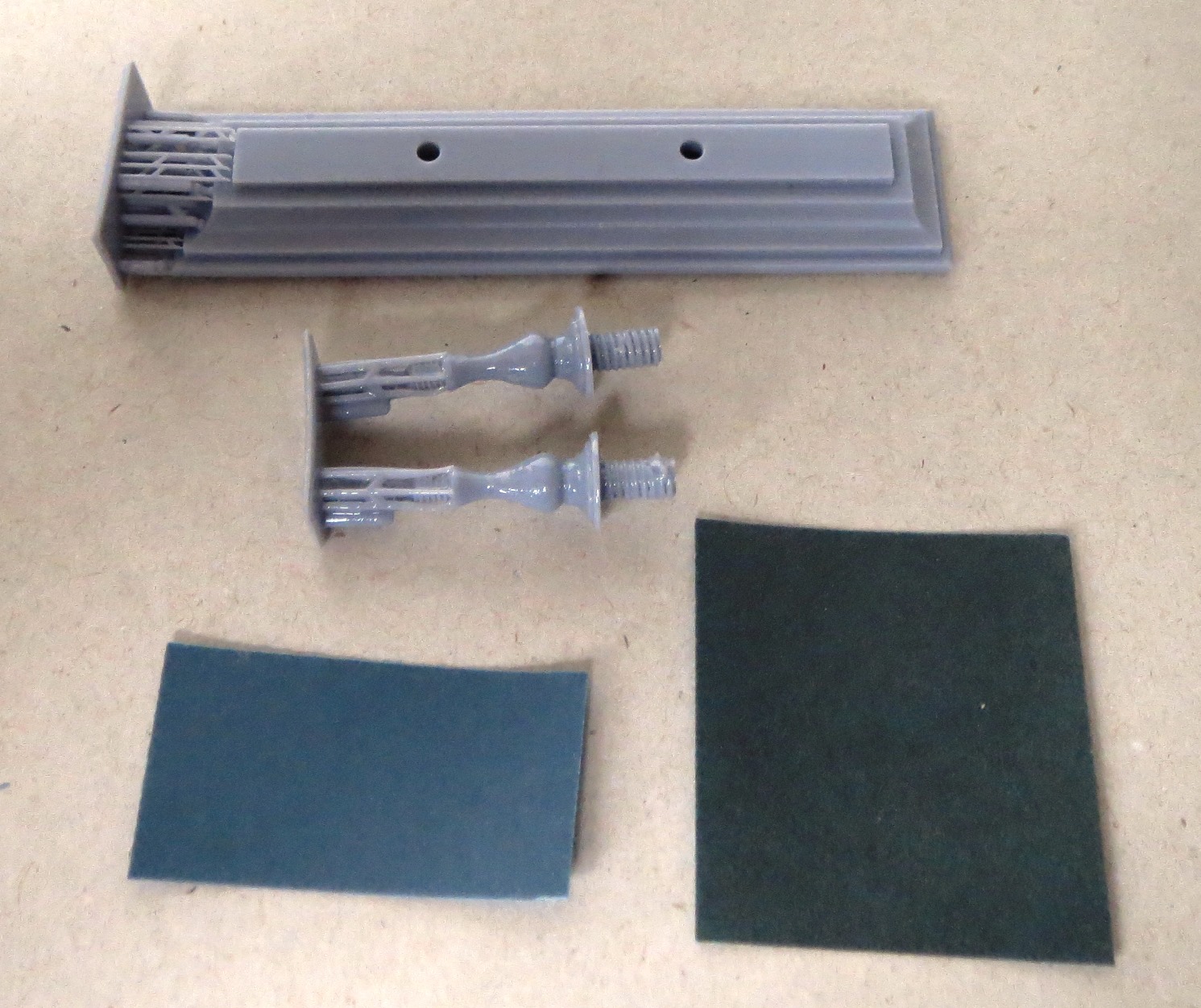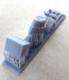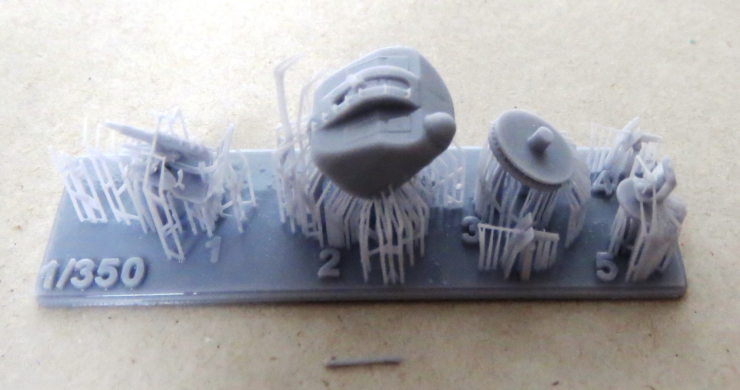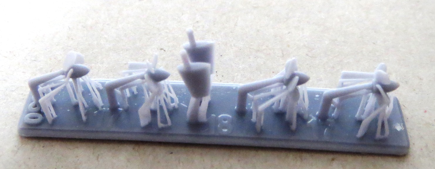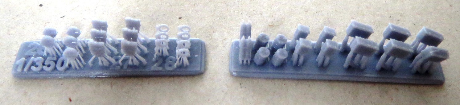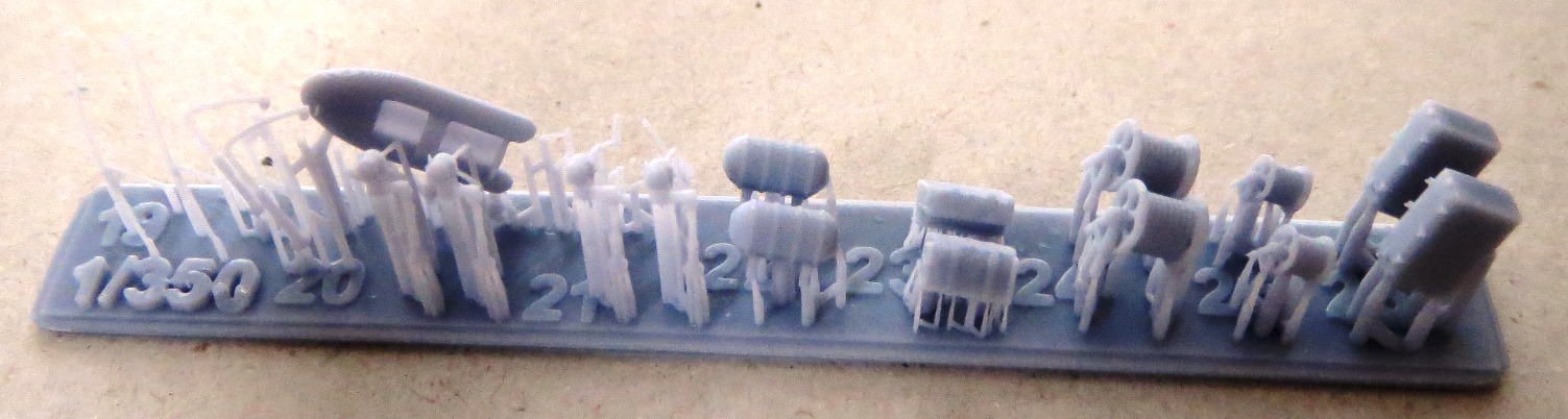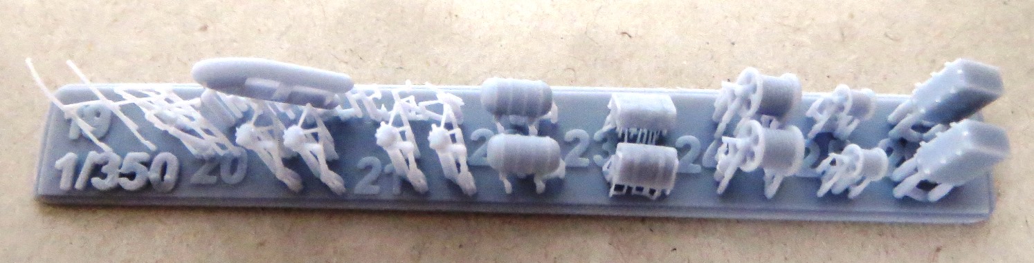 One raft has the main weapons for the US Navy fit, specifically the 3-in gun turret and its base and the 40mm Bofors. The turret is very detailed, with access doors, ladder rungs and gunner’s dome. The barrel which broke off has the small radar dish incorporated on to it. The 40mm Bofors is also nicely detailed. This raft also has the gun director, which is also used with the Hellenic fit, and a pair of single shielded 0.50in machine guns. These are correct for the Hellenic boats but not the USN boats. The lack of twin unshielded 0.50in machine guns is very disappointing and will require looking for aftermarket replacements. Another raft has the 40mm Bofors and bases for the Hellenic Navy fit. A third raft has the large funnel and vent housing, the storage racks for the life raft containers and cylindrical bumpers. The railings around the storage racks were not completely printed, so some suitable photoetch will need to be used to replace them. My sample came with two rafts with the mast. One of the rafts has a cage around the mast to protect it and the other doesn’t. The rafts also have the radars to fit on the mast. The propellers and twin rudders come are on their own raft, with an extra pair of propellers. Two of the rafts have various fitting, such as storage lockers, cable reels, life raft containers in two styles, anchor, signal lamps, Zodiac inflatable, davits, jack and ensign staffs, fuel drums and acetylene tanks. One raft has several life rings, hose racks and another style of racks. A pair of lengths of anchor chains are on a separate raft. One final raft has parts identified as 29 and 30, but I frankly have no idea what they are and they are not referenced in the instructions. As mentioned above, a nice base with two pedestals that are also 3D printed are provided to display the full hull model if you so wish. |