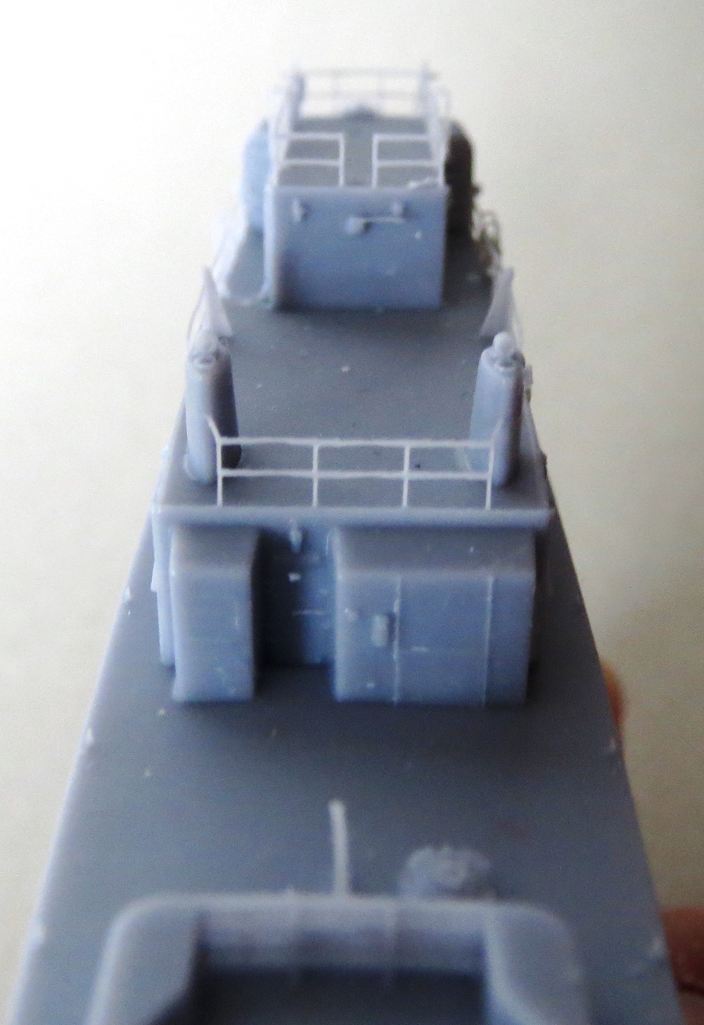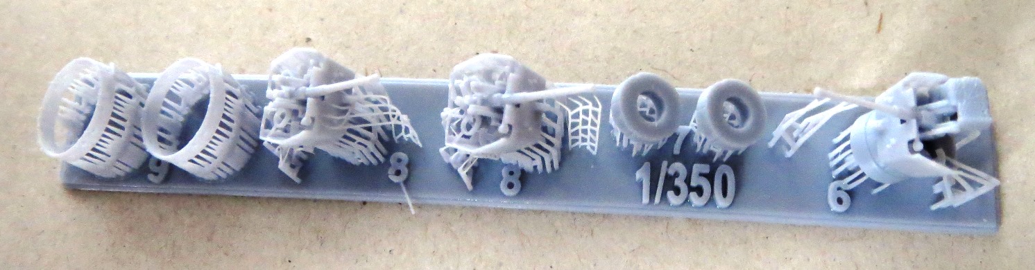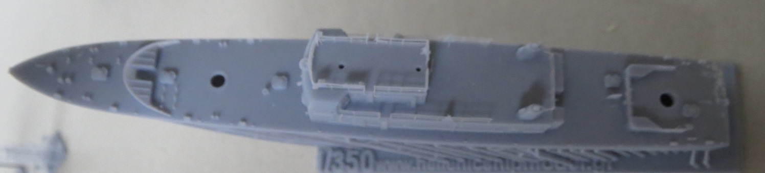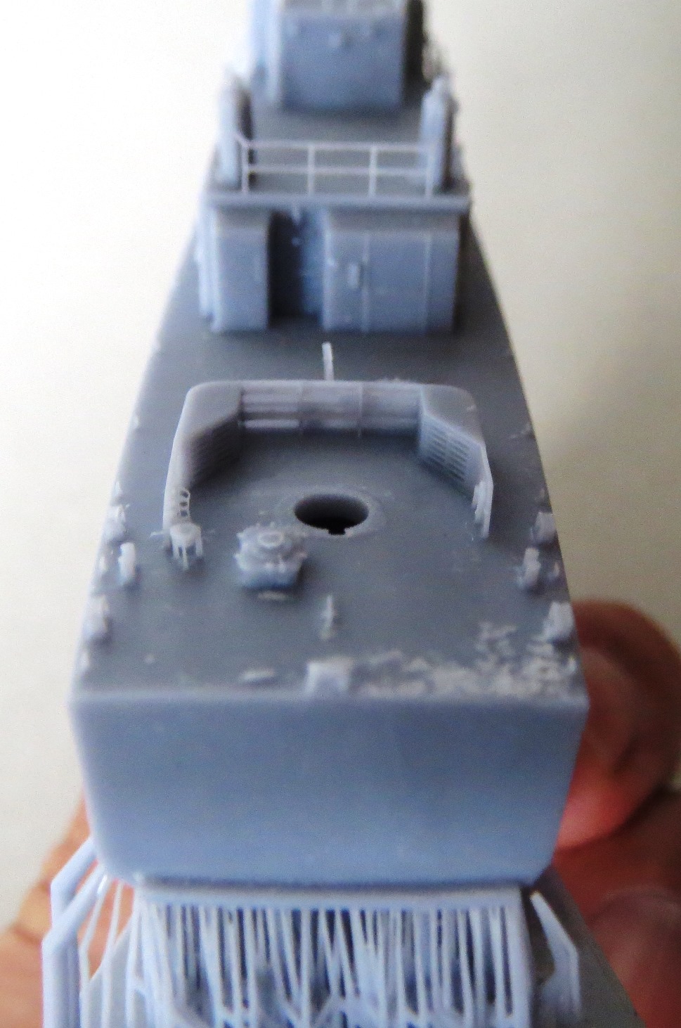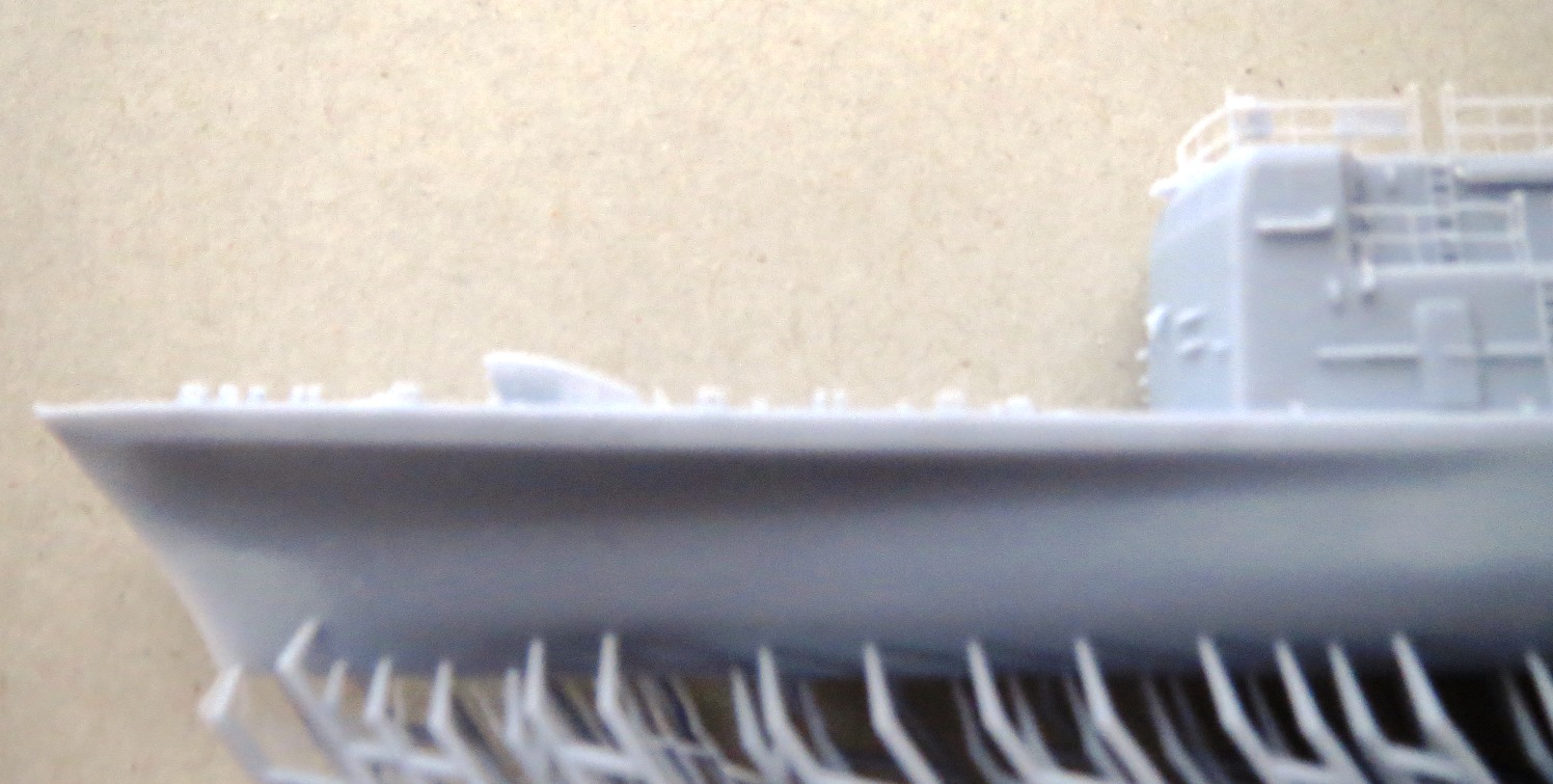 Underneath, and they are hard to see through the printing supports, are the propeller shafts and struts. In 1/350 scale, the hull would be approximately 5.64 inches and the kit hull measures just about that. I cannot see any print lines which attests to the quality of the printing. There is a small rough patch on the starboard stern deck that should be able to be sanded smooth. |