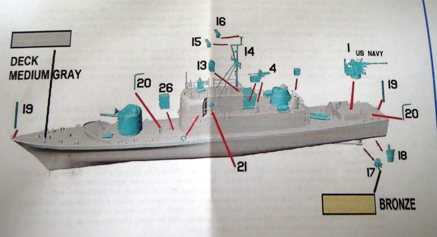 Regardless, I think that the kit part could be used in either position. What I found interesting is that the instructions do not state that the funnel and vent housing are not to be used for the Hellenic Navy boats. Some of the smaller parts provided with the kit are not referenced in the instructions. Painting instructions are provided with generic color references but no decal placement guide is included. However, the Internet has plenty of photos of US Navy ships, specifically Navsource.Net. |