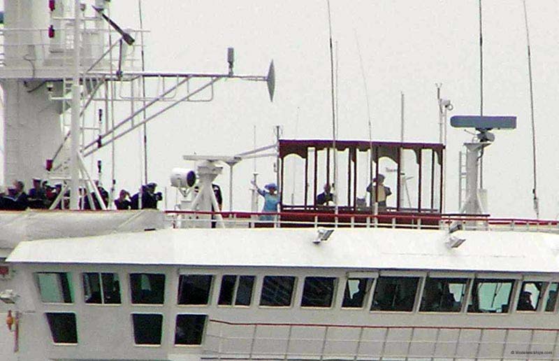 Her Majesty Queen Elizabeth II photographed (at very long range!) inspecting the fleet from the bridge of Endurance.