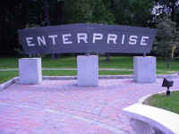 For years, there were 'urban legends' about the stern plate of the USS Enterprise being in some Bergen County, New Jersey town serving as a backstop for a Little League ball field. While on my way to visit a friend in Old Tappan, I made a wrong turn and ended up in Rivervale. Realizing my error, I turned around in the Municipal Parking lot, and a bit of Haze Gray paint caught my eye. I pulled further into the parking to find the immortal words 'Enterprise' on a large chunk of steel. I guess it's not an urban legend anymore. I climbed out of the car with my camera and tripod, set it up, and then stood in front of this piece of history for about 5 minutes just staring it. This little old lady getting into her car asks me if there's something wrong with me. I told her I was I there to see the nameplate, and she tells me if I do anything to deface it she'll have me arrested. So, needless to say, this little old lady got my opinion with both barrels. I gave her a quick lesson of the historical importance of the USS Enterprise, and told her to go away. I think she may have been the mayor... The park it self is nicely done, with the stern plate on the right side of the circular path. In the center of the park, there's a large stone monument dedicated to those from Rivervale that have died in military service, dating back to the Revolution. Sadly, they've left a large open space on the monument for future conflicts. To the left, opposite of the sternplate, is another monument honoring Firefighters, Police Officers, and Rivervale residents that died on September 11th, 2001. There's also no mention of the historical importance of that piece of steel, nor the accomplishments of her crew.