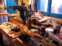 An Artisan on the Isiand of Mykonos, by Bill Keough On a recent trip to Greece, my wife and I were having dinner in the Little Venice area on the Island of Mykonos, when directly in front of our table the doors of a garage opened up and a man took out a table and started working on small wooden sailing ships. The garage was his workshop and when I saw the inside, I nearly fell off my chair. After dinner, we appropached the gentlemen and asked if I could take some pics and he agreed. I am married to a Greek so there were no problems in communication. We were able to ascertain that he has been scratchbuilding in wood for nearly 50 years and has done some commissioned work for the Athens Naval Museum. If any one is ever in Mykonos, please try and see this fellow. He doesn't speak English, but he is very personable once he knows you are a model ship enthusiast. Enjoy the few pics I was able to take |