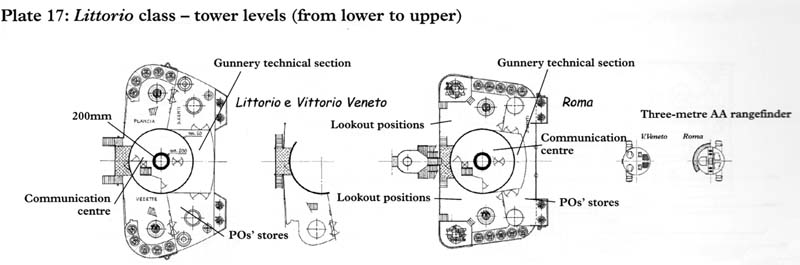 This work convers in good detail the processes and decisions that went into the Littorio design. Each weapon system is discussed; the various guns, as well as including the uncommon aircraft arrangements of this class. The book's photographs are of varied sizes, but close up, detailed shots are uncommon. Many of these photos come from the personal collections of the authors, or has the source cited in the caption. The authors took care to attempt to date most of the images, which is an important detail for modelers. This book also has drawings and plans from a variety of sources; ones drawn for publication by Roberto Maggi, Maurizio Brescia and Angelo Brioschi, as well drawings taken from original shipyard plans or drawings based on them from the archives of the Associazione Navimodellisti Bolognesi (Naval Modellers Association of Bologna). There are also some color plates showing some of the camoflague schemes and colors sported by the aircraft carried by these battleships, some of which are fold- out for size. |