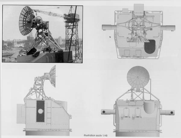 | There are several scaled drawings of the various guns and other fittings such as the Mk 37 5" gun director with the Mk 25 fire control radar fitted as shown on the right. In addition to the gun director drawings you also find drawings of: | ![]() |