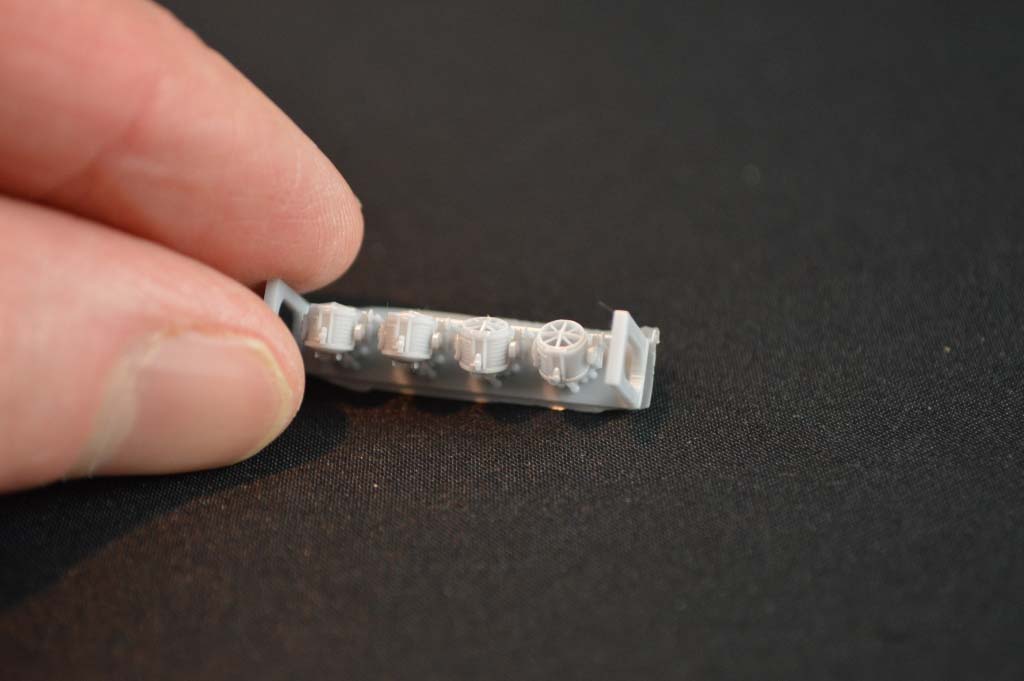 bottom of the packaging with double sided tape. There are four 44in searchlights in the package. The searchlights are printed in three different positions. There is some terrific detail to be found on each searchlight, with well defined grab handles and hand wheels, as well as the frame for the lens. |