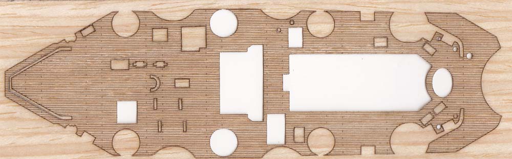 This deck set from Wood Hunter is for the Trumpeter 1/700 USS North Carolina BB-55, issued in 2006. The light-color wood decks are approximately .008"/.2mm thick, with regular planks and other deck details laser etched into the woodm and an adhesive applied to the back. A light tracing with a hobby knife is all that is necessary to free the parts.