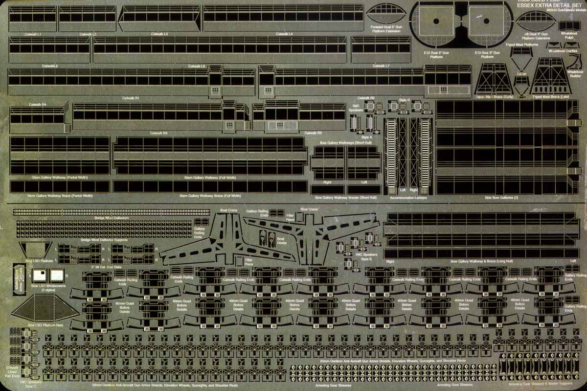 | If you are building the Trumpeter Essex, you probably already have the Gold Medal Models Fitting set. This set takes over in the super detailing options where that one left off. For the modeler so inclined, there are new catwalks to mount around the flightdeck for an effect that will really enhance your Essex Class Carrier. | |||||