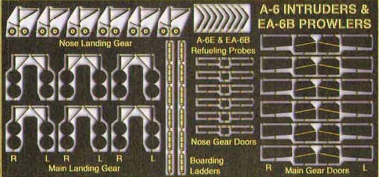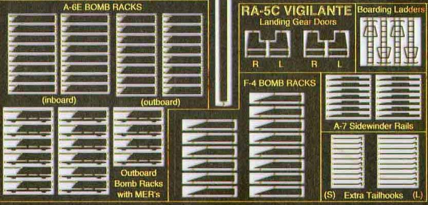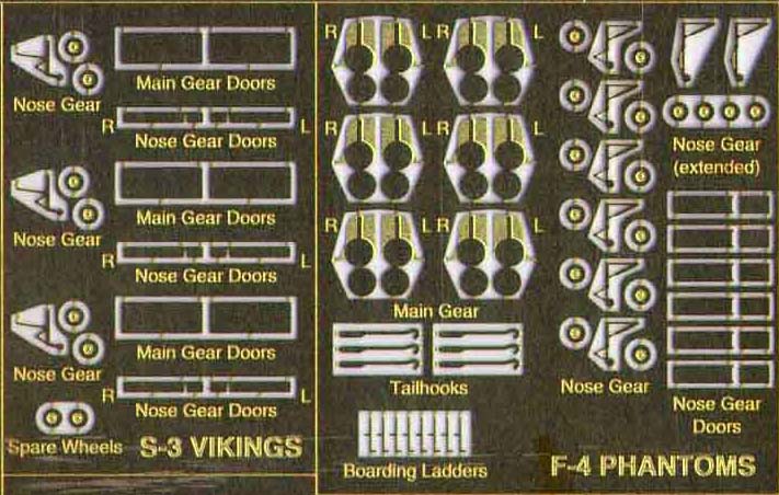 | The new Trumpeter 1/350 Nimitz Class Carrier has made quite a splash on the market. It builds nicely out of the box, and includes the best 1/350 scale aircraft on the market. But as with any kit, they can use some extra detailing. The aircraft are lacking under wing details and while their plastic landing gear and props are really thin, they are thicker than a true scale parts due to the limitations of injection molding. This Gold Medal Models set will remedy that situation and allow you to have true scale details. This set will allow you to do 1/4 of a typical supercarrier airwing. So if you are going to display your carrier with a full airwing on deck, you will need four of this set. | |||||||||