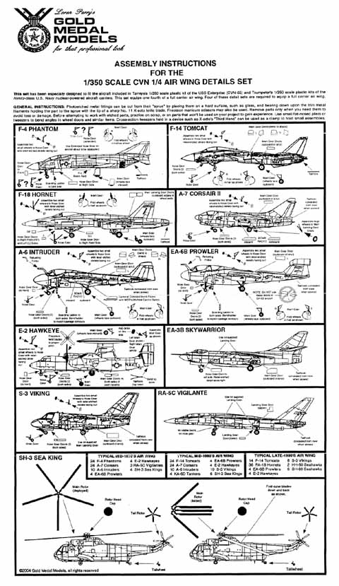 This is an excellent set for any 1/350 modern carrier. Besides the Trumpeter kit, it will also do a 1/350 USS Enterprise airwing. This set has a retail price of $24.00 US and is available direct from Gold Medal Models or wherever fine ship accessories are sold. |