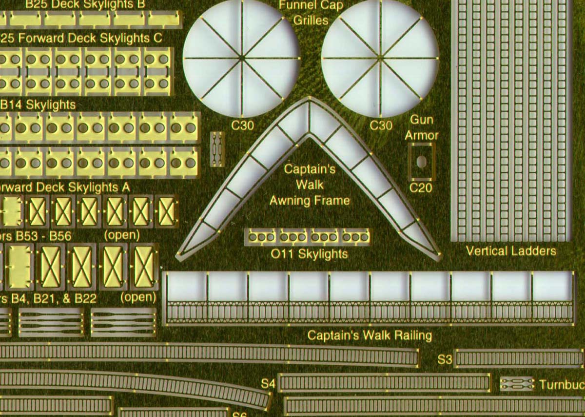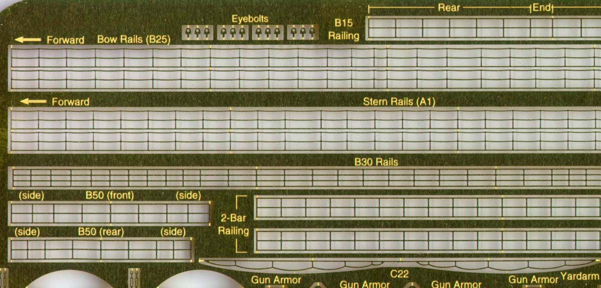| The Borodino frets includes custom cut rails sized to fit the kit. They are clearly labeled and noted on the instructions as to their position and the bends you will need to make. I really love this approach, it is the next best thing to pre bent rails. The rails come in a variety of styles, with a drooped chain appearance on the outer rails. The solid bar rails come in two and three bar styles. The boat details are very nice and will allow you to super detail the various launches. They feature new relief etched thwarts that will give your crew a scale thickness seat to row from. Large and small oars will help propel them and each boat has a properly sized rudder to steer them. The steam launch rudders have propeller details. Speaking of propellers, two and three bladed screws are provided for the ship. Once bent and attached these will look much better than the thick plastic ones in the kit. Doors and hatches are beautifully relief etched with hinges, latches, and frames really standing out. The skylights are etched at half thickness with porthole frames etched at full to really make them stand out. You also get other important items like funnel cap grills and gun armor plates | |||||||