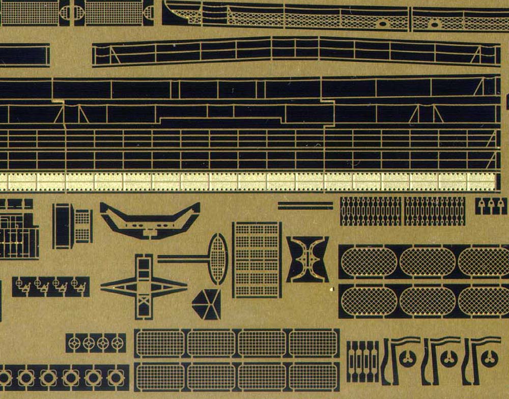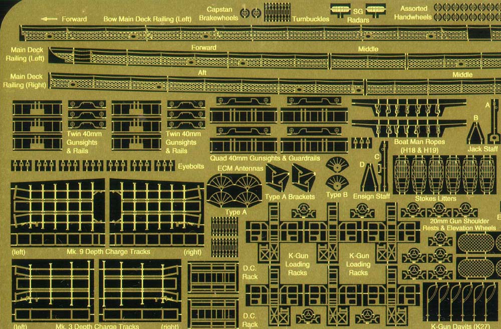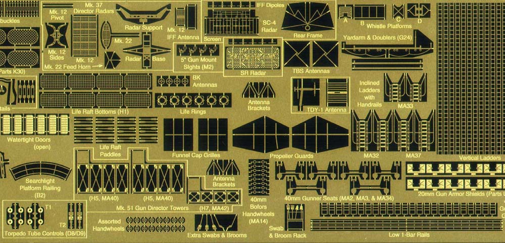 | If you have ever had trouble hanging that boat from the kit supplied davits, then you will appreciate the boat pulley details in this set. Scale thickness depth charge roller and storage racks are improvements in the kit parts. Another really nice touch was the flagstaff and jackstaff for the bow and stern. If you don't think the kit torpedo training gear is detailed enough, then try out the one supplied on this fret. There are hand wheels with cranks and a control panel with gauges. | ||||||