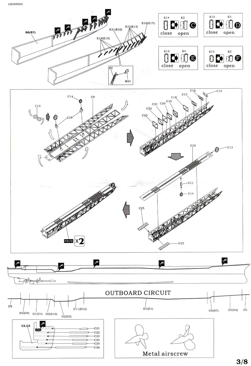 This fret includes the degaussing cables to be applied to the hull. They are done in segments with strap details and are noted as to their placement on page 3 of the instructions. |