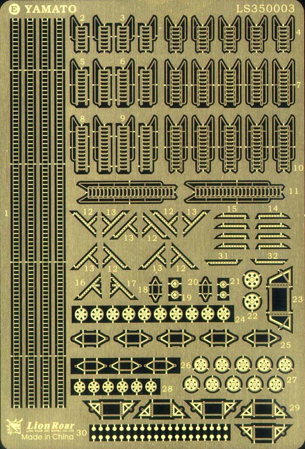 | This new set from Lion Roar of China is specifically designed for the popular Tamiya Yamato kit. It includes just about every after market item you would want to add. It comes packaged in as an attractive boxed set with 14 different photo etch frets, machined brass gun barrels, cast propellers, and even scale anchor chain. All the parts are securely wrapped and protected. | |||||||||||