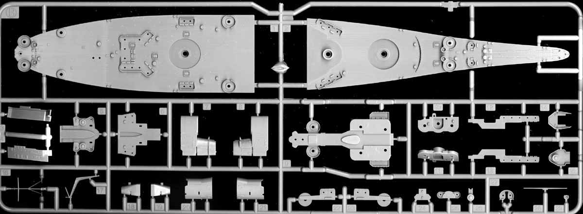 The two weapons sprues included have some really nice main gun turrets, and a lot of really fine weapons. The quad 40's and 20 mm guns are delicately molded. A couple of Kingfisher and Sea hawk float planes are included so you can do a 44 or 45 version of the Missouri. There are even a few extra parts to help build up your spare parts bin. Like other waterline kits this one has the waterline hull insert with metal weights and even delrin plastic turret bushings to allow the guns to rotate freely. |