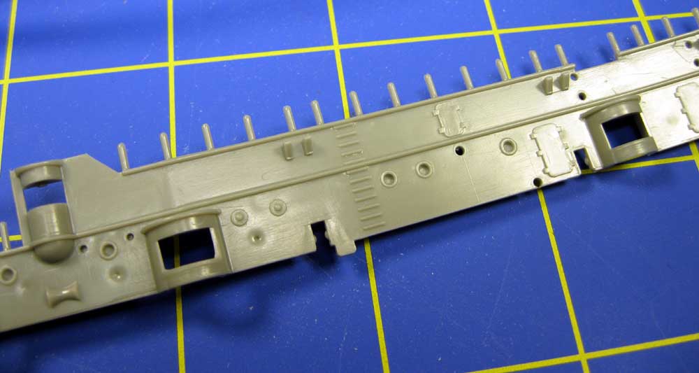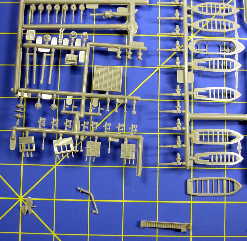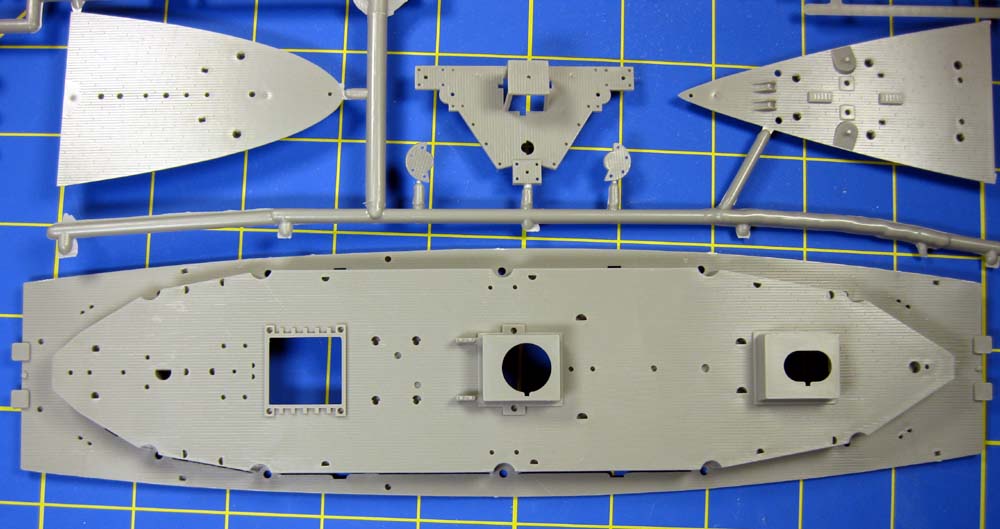 Like Sprue A, Sprue B is molded with no exterior frame, making the sprue somewhat unsupported. One of the bulkheads for the superstructure was badly malformed in our review sample, due to the unsupported nature. Likewise, there were some parts knocked loose in shipping. |