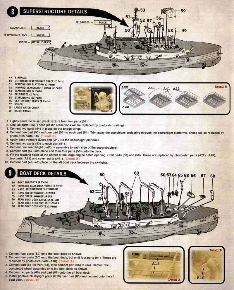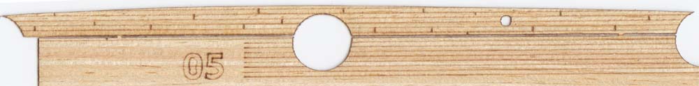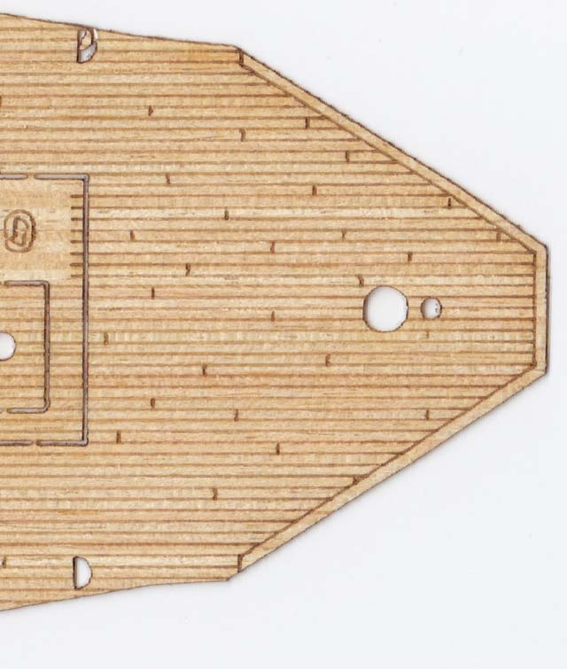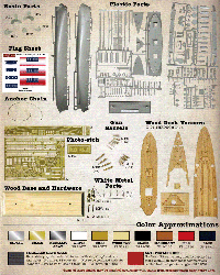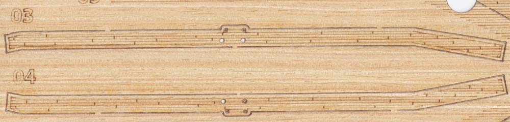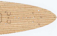Olympia comes with raised planking detail molded on the decks, a nice detail 50 years ago, but unsuitable for many of today's discerning modelers. Capitalizing on the current trend of replacement wooden decks (veneers), Encore had KA Models craft a set of self-adhesive pre-cut decks. There are 13 pieces of veneer for covering the main deck, boat deck, bridge and conning stations. |