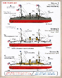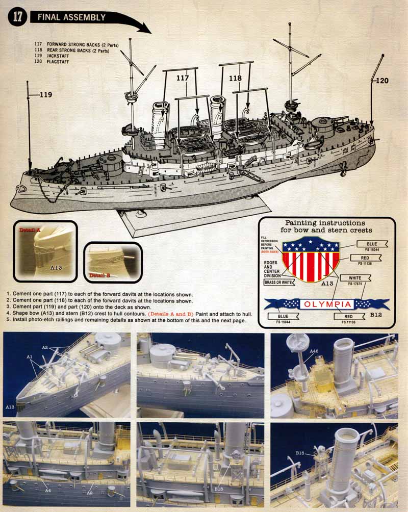 This full-color instruction booklet is laid out differently form a normal booklet, but well done. It has a mix of illustrations and real pictures showing each part of the assembly sequence, with numbered steps on the bottom of each page. Some of the steps also reference "Details", which smaller thumbnails to illustrate the particulars indicated in that step's text. The text of these steps indicate a fair amount of items to be removed and replaced, and in some cases filled and modified. The last page of the instructions are a color and painting guide, with color schemes for 3 eras, including the Battle of Manila Bay. As always, please read through and study the instructions before assembly. Also included with the instruction is an appeal to Save the USS Olympia. |
