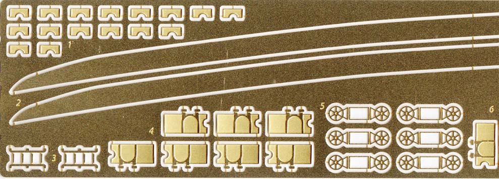 There are 3 pieces of KA Models photoetch in this kit; two sheets of with multiple parts, and an etched nameplate. These sheets of relief-etched brass have a wide variety of upgrade parts and are all well done. Sheet A has the railings for Olympia, replacing the molded-on stanchions. There are also a number of replacement watertight doors, a new wheelhouse, ladders, funnel screens, bases for the 6-pounders and a replacement crest for the bow. There is also a nice assembly for upgrading the engine room hatch and skylights. Sheet B is a long thin sheet, and has the bilge keels as well as a few remaining parts, like hose reels and chocks for the boats. |