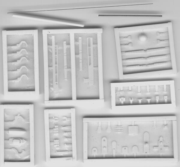 | Miscellaneous parts are cast on resin sprues similar to injection molding processes. The parts are pretty well cast with a thin layer of resin flash that needs to be removed. Plastic and brass rod is also provided for making some of the mast parts. | ![]() |