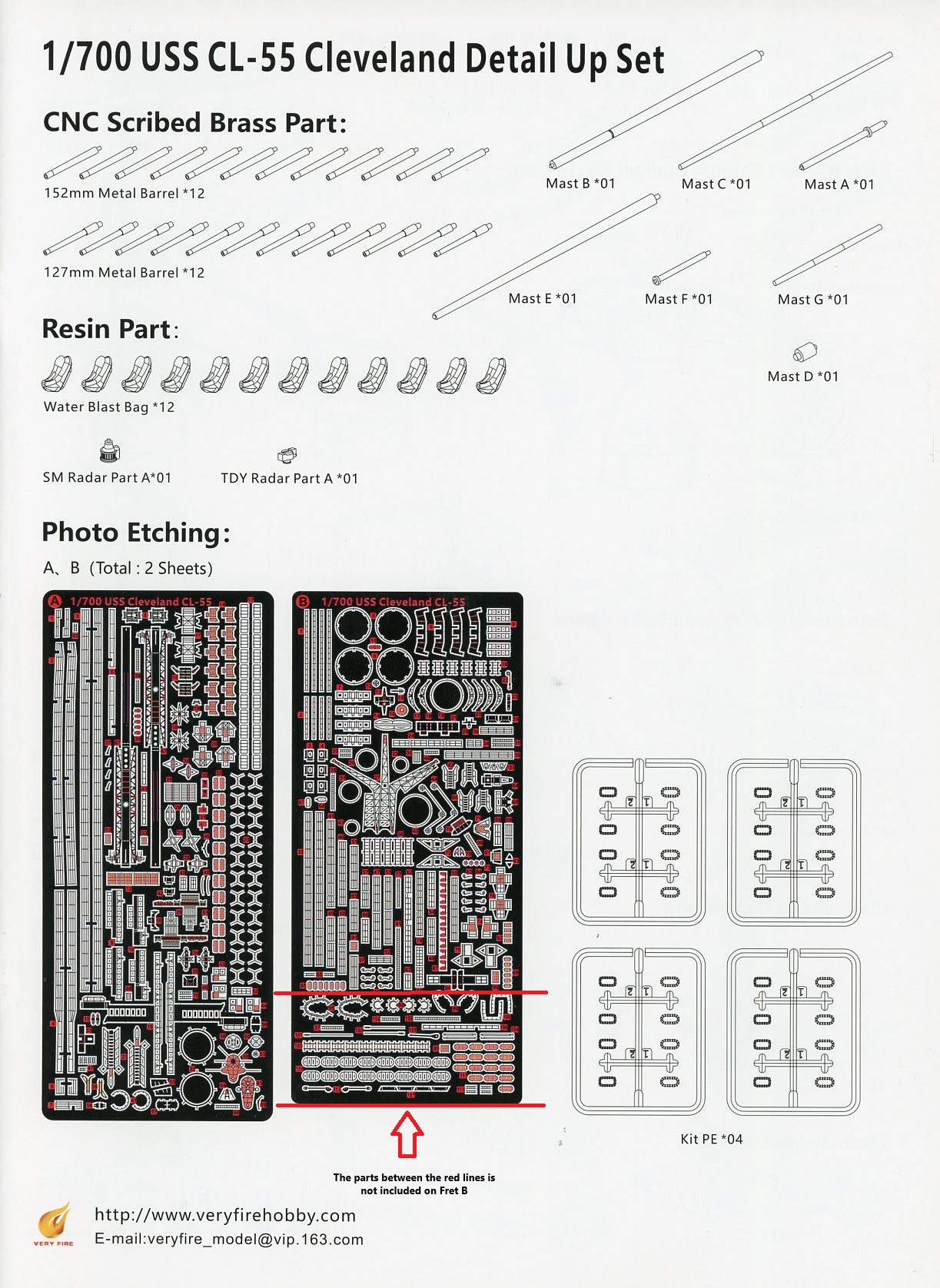 Very Fire has released several US navy cruiser in 1/700. One of the latest is the World War II light cruiser USS Cleveland. This is the deluxe version of the kit. It contains over twenty plastic sprues, turned brass parts, anchor chain and photo-etch. |