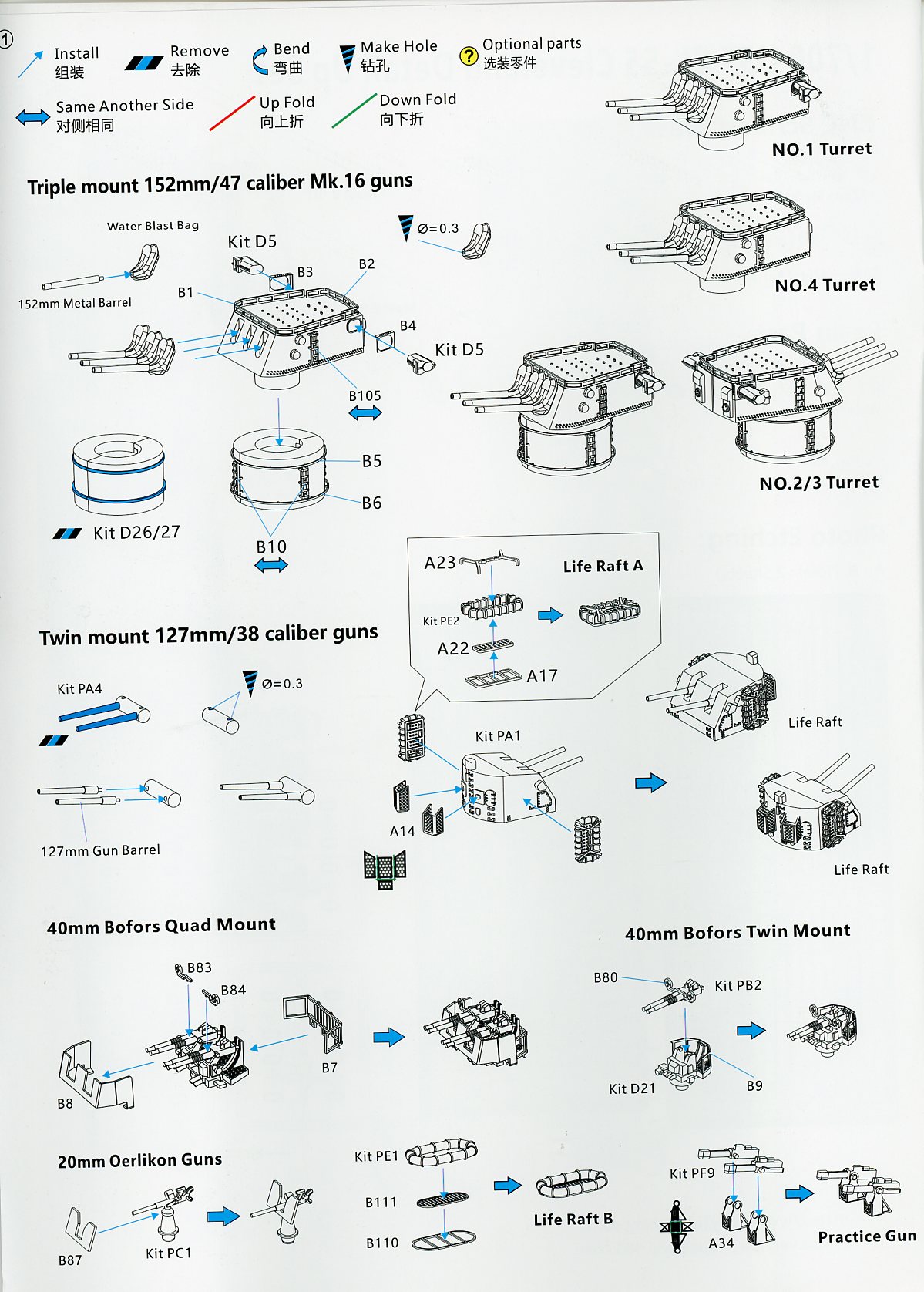 PA (X3) - 5 in gun turrets, Mk37 director, boats, bridge equipment PB (X4) - 40mm guns (sans shields) PC (X2) - 20mm guns (sans shields) and ready ammo boxes PD (X3) - Capstan parts, other anchor handling equipment PF (X3) - Winches, paravanes PG (X1) - Searchlights, signal lamps, lookout postions PH (X2) - Seaplanes |