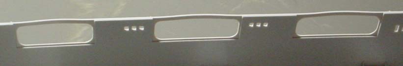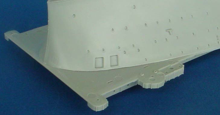 | Initial impression in the box is very favorable. As I have a friend with a model shop I've seen four of them recently opened and I've noticed something similar in all of them. There are rounded-off openings both port (four) and starboard (one) near the top of the hull for the boat pockets and the thin plastic on the top bulges outwards as if the hull was sagging (nautical term where the center of the ship sags downwards in relationship to the bow and stern, The opposite is hogging) and applying pressure on the top of the hull. In one case one of these pieces had broken from the stress. I laid my upper hull out on a flat surface and found no evidence of warp in it, so I'm still a little unsure as to what causes this. Thankfully, it's not that difficult to fix. | |||||||