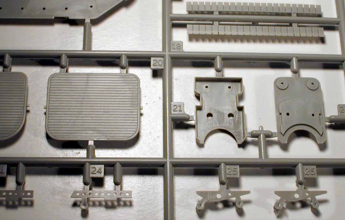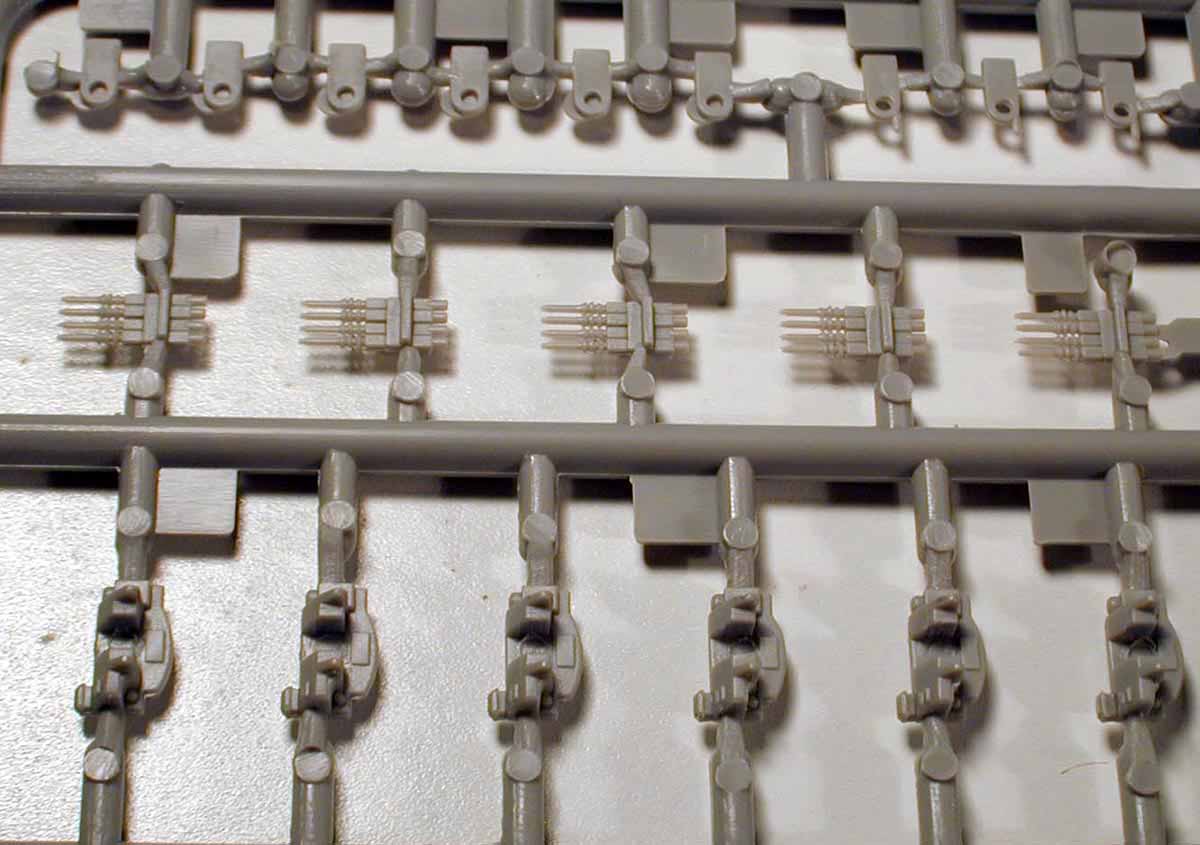 Is the weapons spue. Two are included with 50cal. 20 mm, 1.1" quad, and 5" gun mounts. All are pretty well done. I like the way the 20 mm guns are done, but the 1.1" gun barrels have what looks like recoil springs molded on. A little Mr. Surfacer putty will help fill these in and make them look better. The sprue also includes ships boats and even the cradles that they are mounted on.Other parts are also well molded.