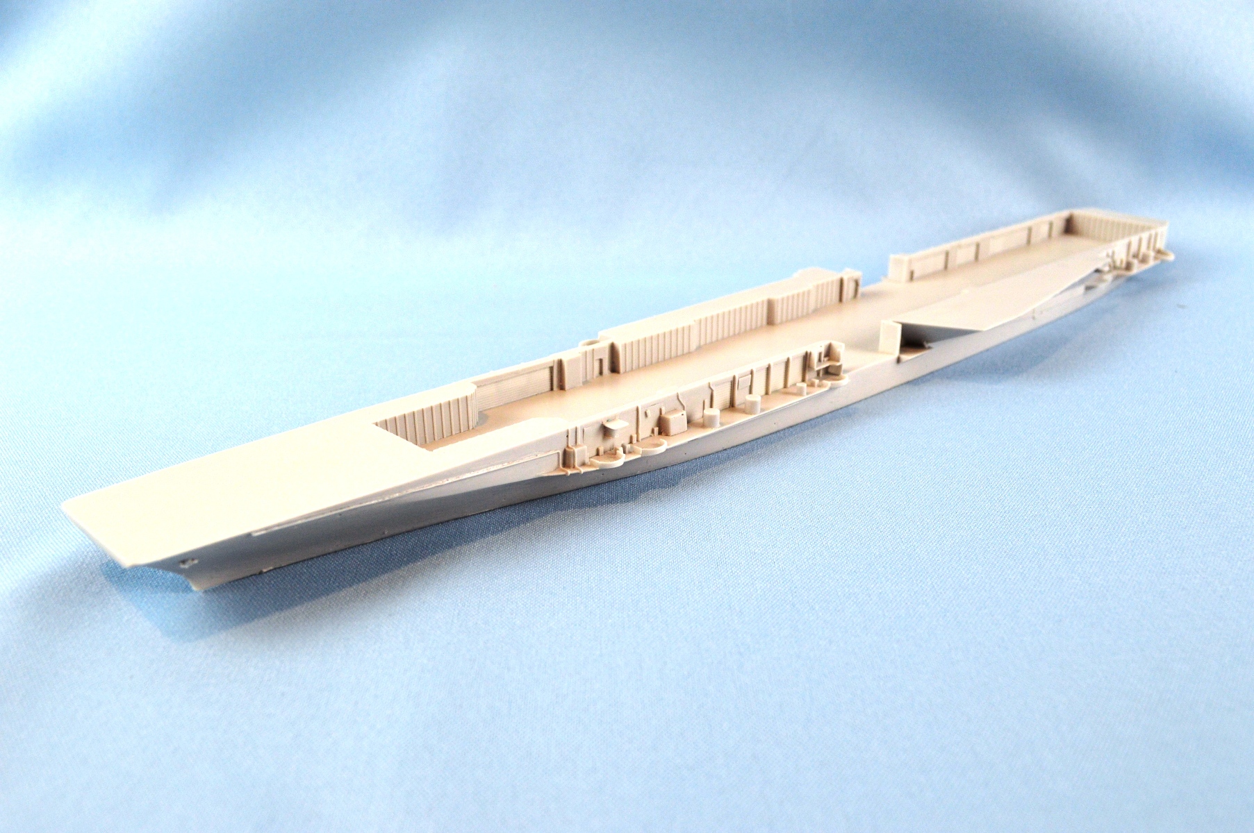 | This is the second of two poured resin parts included. It is one large piece, with some over pour on the bottom (or hangar overhead) side. On my sample, the over pour was more pronounced at the bow. Catwalks and some other details are cast integral to the part. There are some recessed lines for the catapults and arresting gear cast as part of the deck. The bridle catchers are the weakest part of the flight deck, but photo-etch replacements - that are apparently more accurate - are included in the photo-etch set. This part was also reworked by Corsair Armada, in part to allow the flight deck to fit properly to the hull. | |||||||||||||||||